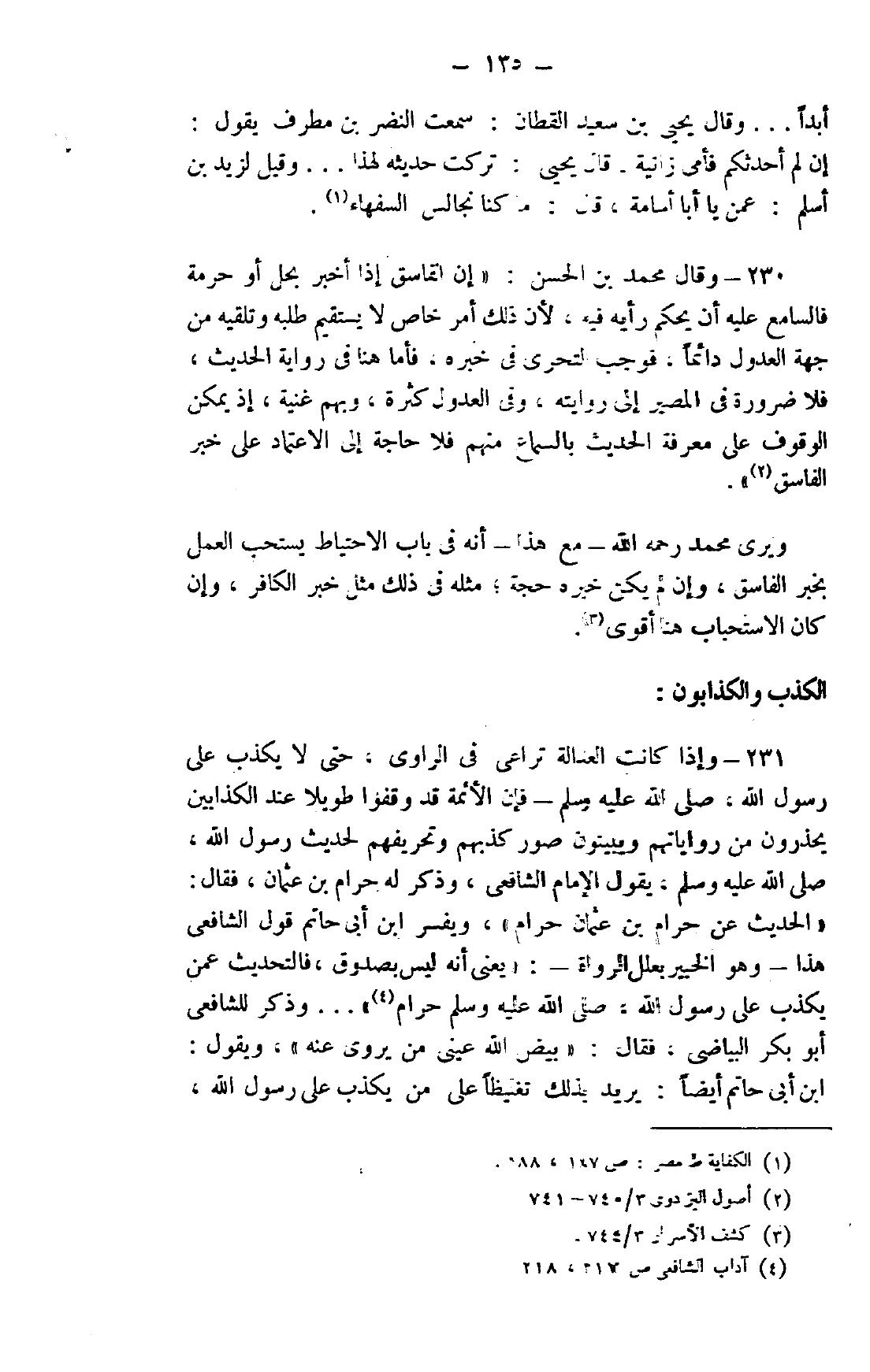 230- وقال محمد بن الحسن: "إن الفاسق إذا أخبر بحل أو حرمة فالسامع عليه أن يحكم رأيه فيه، لأن ذلك أمر خاص لا يستقيم طلبه وتلقيه من جهة العدول دائمًا، فوجب التحري في خبره، فأما هنا في رواية الحديث، فلا ضرورة في المصير إلى روايته، وفي العدول كثرة، وبهم غنية، إذ يمكن الوقوف على معرفة الحديث بالسماع منهم فلا حاجة إلى الاعتماد على خبر الفاسق"2.