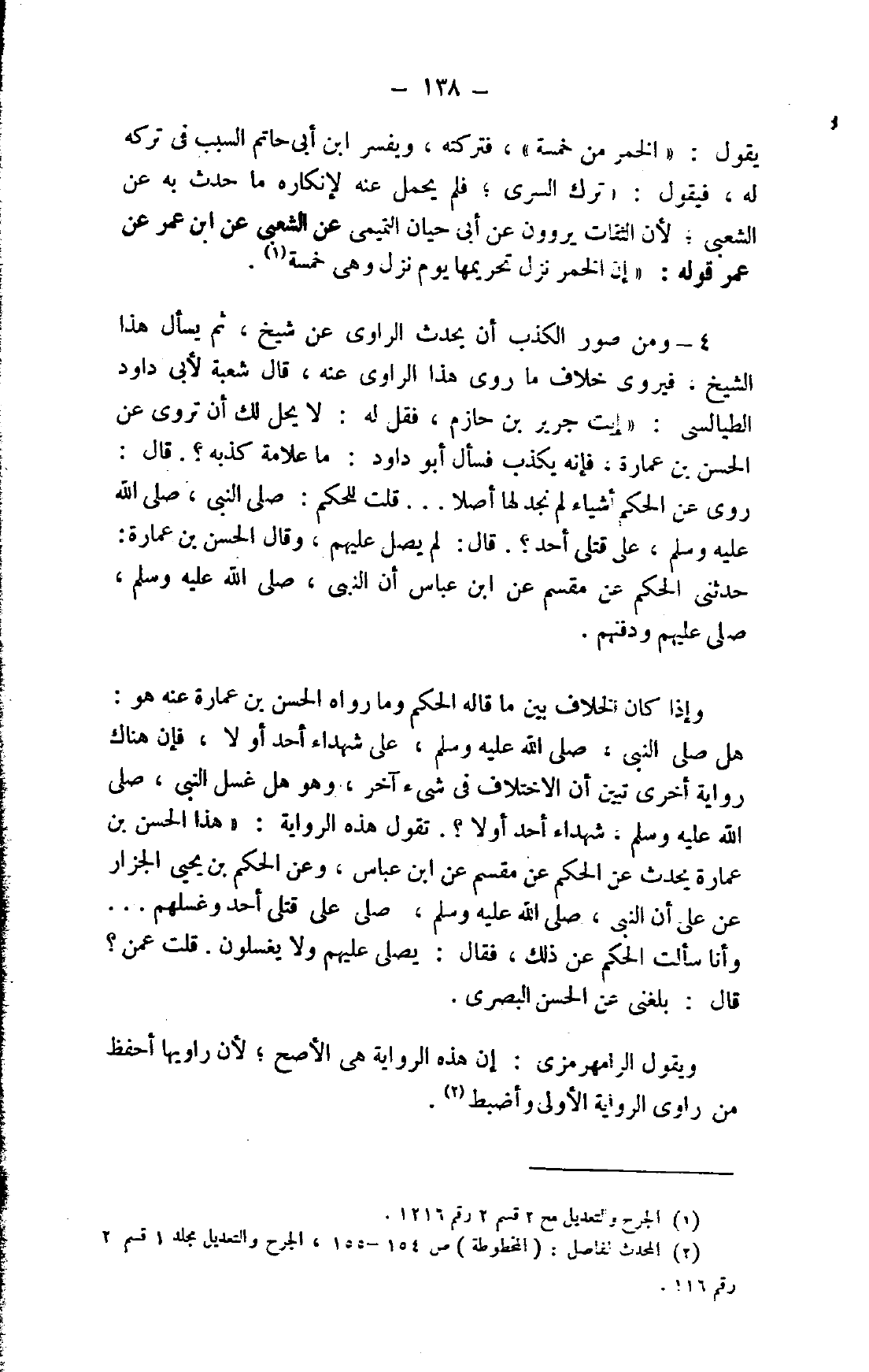 يقول: "الخمر من خمسة" فتركته، ويفسر ابن أبي حاتم السبب في تركه له، فيقول: "ترك السري؛ لم يحمل عنه لإنكاره ما حدث به عن الشعبي؛ لأن الثقات يروون عن أبي حيان التميمي عن الشعبي عن ابن عمر عن عمر قوله: "إن الخمر نزل تحريمها يوم نزل وهي خمسة 1.