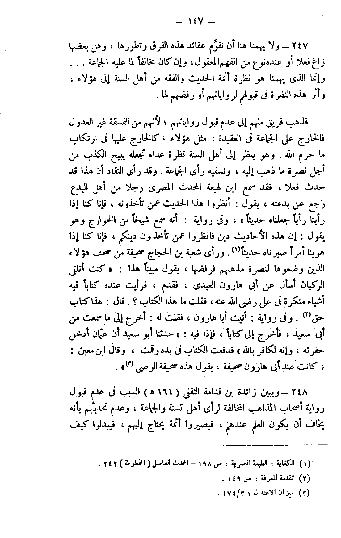 248- ويبين زائدة بن قدامة الثقفي "161هـ" السبب في عدم قبول رواية أصحاب المذاهب المخالفة لرأي أهل السنة والجماعة، وعدم تحديثهم بأنه يخاف أن يكون العلم عندهم، فيصيروا أئمة يحتاج إليهم، فيبدلوا كيف