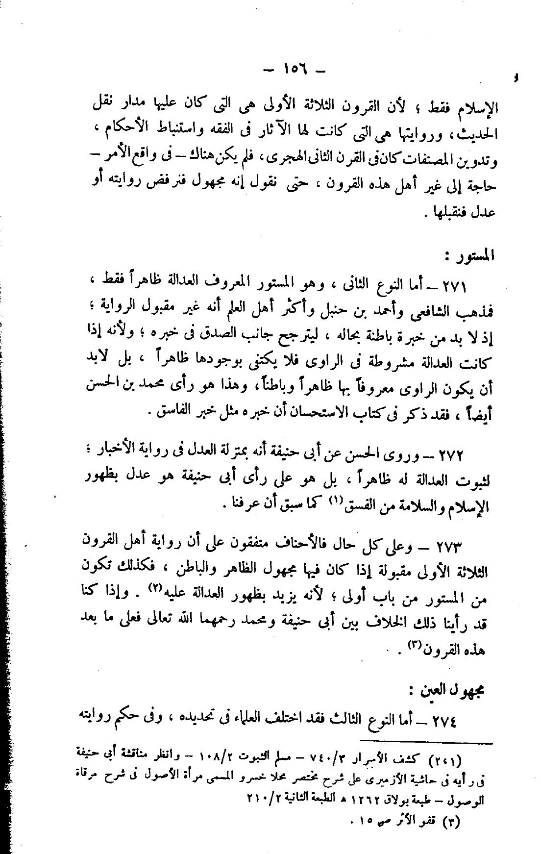 273- وعلى كل حال فالأحناف متفقون على أن رواية أهل القرون الثلاثة الأولى مقبولة إذا كان فيها مجهول الظاهر والباطن، فكذلك تكون من المستور من باب أولى؛ لأنه يزيد بظهور العدالة عليه2. وإذا كنا قد رأينا ذلك الخوف بين أبي حنيفة ومحمد رحمهما الله تعالى فعلى ما بعد هذه القرون3.