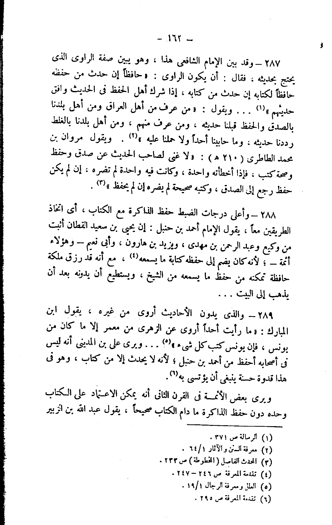 288- وأعلى درجات الضبط حفظ الذاكرة مع الكتاب، أي اتخاذ الطريقين معًا، يقول الإمام أحمد بن حنبل: إن يحيى بن سعيد القطان أثبت من وكيع وعبد الرحمن بن مهدي، ويزيد بن هارون، وأبي نعيم -وهؤلاء أئمة- لأنه كان يضم إلى حفظه كتابة ما يسمعه4، مع أنه قد رزق ملكة حافظة تمكنه من حفظ ما يسمعه من الشيخ، ويستطيع أن يدونه بعد أن يذهب إلى البيت ...