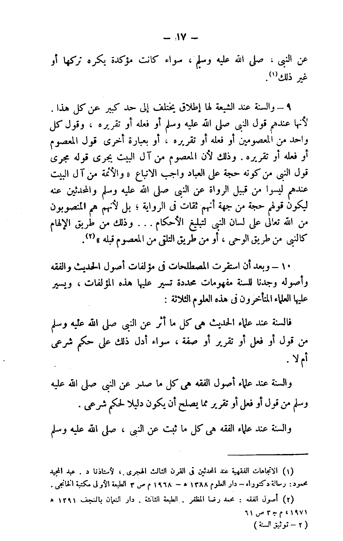9- والسنة عند الشيعة لها إطلاق يختلف إلى حد كبير عن كل هذا. لأنها عندهم قول النبي -صلى الله عليه وسلم- أو فعله أو تقريره، وقول كل واحد من المعصومين أو فعله أو تقريره، أو بعبارة أخرى قول المعصوم أو فعله أو تقريره.