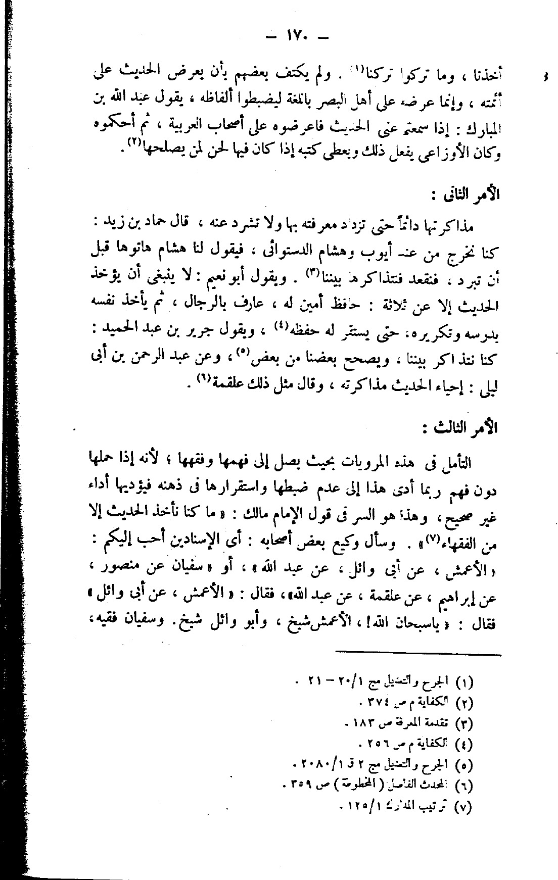 مذاكرتها دائمًا حتى تزداد معرفته بها ولا تشرد عنه، قال حماد بن زيد: كنا نخرج من عند أيوب وهشام الدستوائي، فيقول لنا هشام: هاتوها قبل أن تبرد، فنقعد فنتذاكرها بيننا3. ويقول أبو نعيم: لا ينبغي أن يؤخذ الحديث إلا عن ثلاثة: حافظ أمين له، عارف بالرجال، ثم يأخذ نفسه بدرسه وتكريره، حتى يستقر له حفظه4، ويقول جرير بن عبد الحميد: كنا نتذاكر بيننا، ويصحح بعضنا من بعض5، وعن عبد الرحمن بن أبي ليلى: إحياء الحديث مذاكراته، وقال مثل ذلك علقمة6.