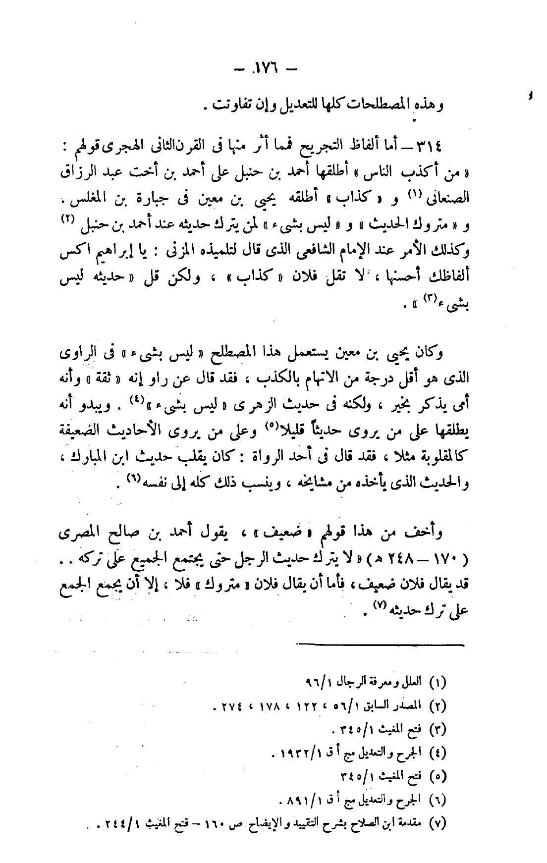 314- أما ألفاظ التجريح فمما أثر منها في القرن الثاني الهجري قولهم: "من أكذب الناس" أطلقها أحمد بن حنبل على أحمد بن أخت عبد الرزاق الصنعاني1 و"كذاب" أطلقه يحيى بن معين في جبارة بن المغلس. و"متروك الحديث" و"ليس بشيء" لمن يترك حديثه عند أحمد بن حنبل2 وكذلك الأمر عند الإمام الشافعي الذي قال لتلميذه المزني: يا إبراهيم، اكس ألفاظك أحسنها، لا تقل فلان "كذاب"، ولكن قل "حديثه ليس بشيء"3.