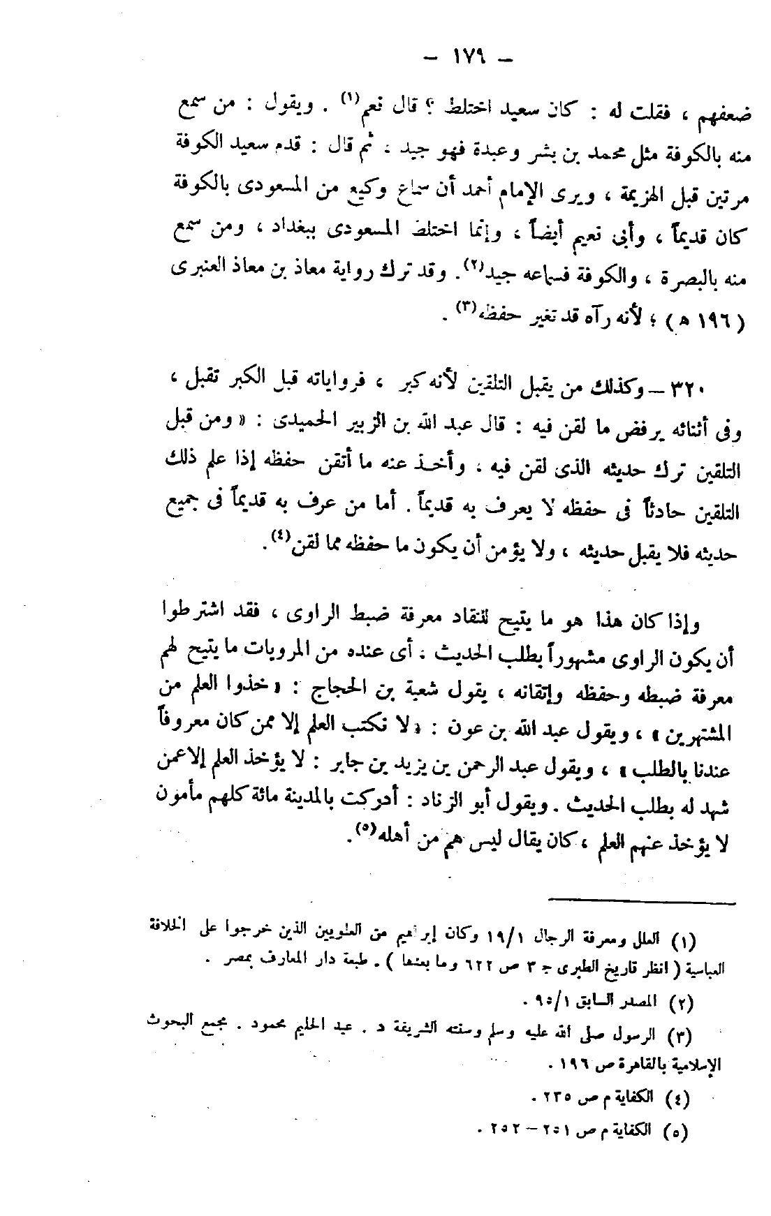 ضعفهم، فقلت له: كان سعيد اختلط؟ قال: نعم1. ويقول: من سمع منه بالكوفة مثل محمد بن بشر وعبدة فهو جيد، ثم قال: قدم سعيد الكوفة مرتين قبل الهزيمة، ويرى الإمام أحمد أن سماع وكيع من المسعودي بالكوفة كان قديمًا، وأبي نعيم أيضًا، وإنما اختلط المسعودي ببغداد، ومن سمع منه بالبصرة، والكوفة فسماعه جيد2. وقد ترك رواية معاذ بن العنبري "196هـ"؛ لأنه رآه قد تغير حفظه3.