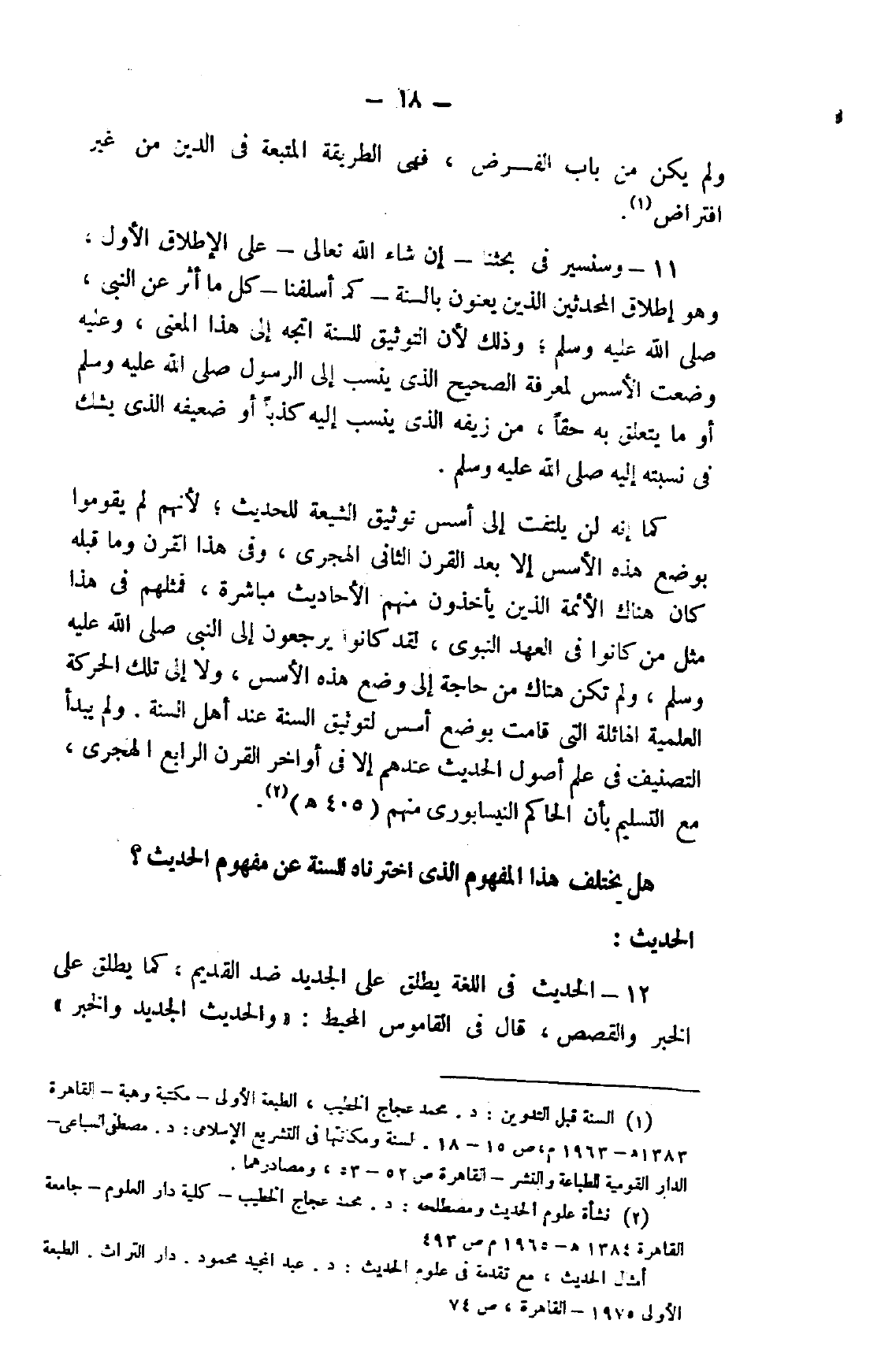 11- وسنسير في بحثنا -إن شاء الله تعالى- على الإطلاق الأول، وهو إطلاق المحدثين الذين يعنون بالسنة -كما أسلفنا- كل ما أثر عن النبي، صلى الله عليه وسلم؛ وذلك لأن التوثيق للسنة اتجه إلى هذا المعنى، وعليه وضعت الأسس لمعرفة الصحيح الذي ينسب إلى الرسول صلى الله عليه وسلم أو ما يتعلق به حقًّا، من زيفه الذي ينسب إليه كذبًا أو ضعيفه الذي يُشك في نسبته إليه صلى الله عليه وسلم.