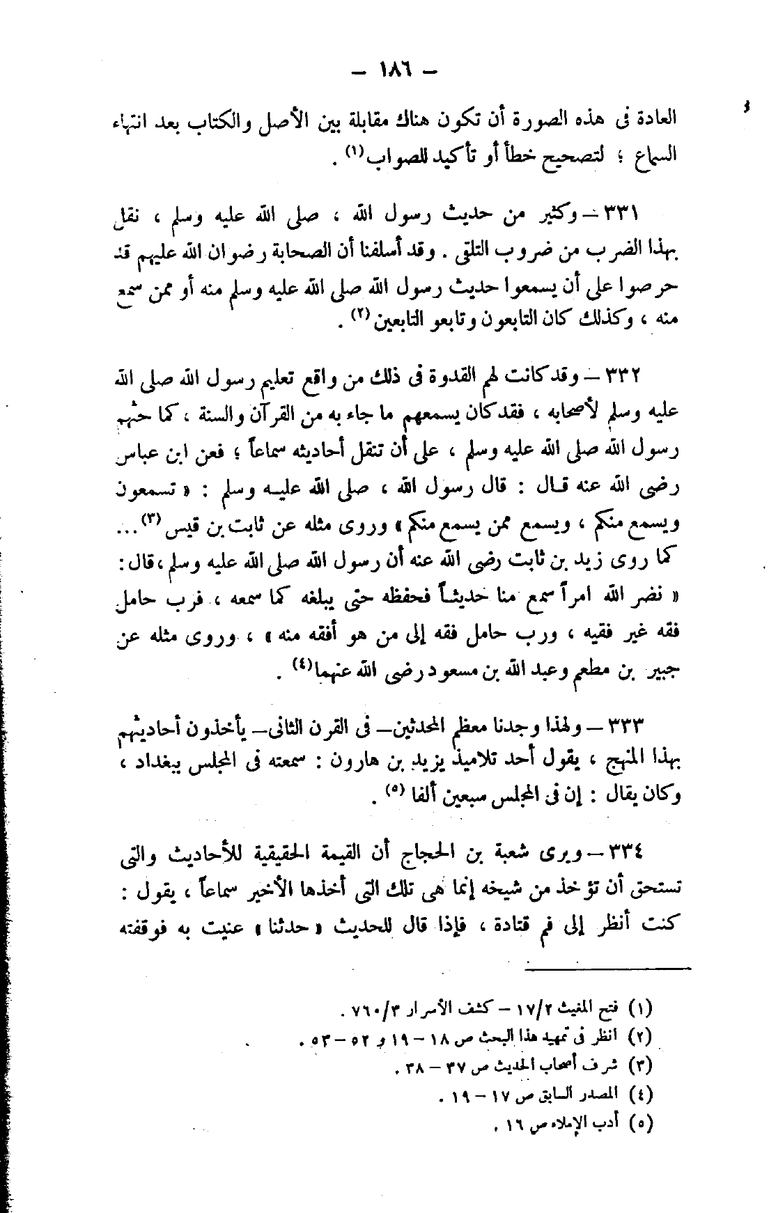 334- ويرى شعبة بن الحجاج أن القيمة الحقيقية للأحاديث والتي تستحق أن تؤخذ من شيخه إنما هي تلك التي أخذها الأخير سماعًا، يقول: كنت أنظر إلى فم قتادة، فإذا قال للحديث "حدثنا" عنيت به فوقفته