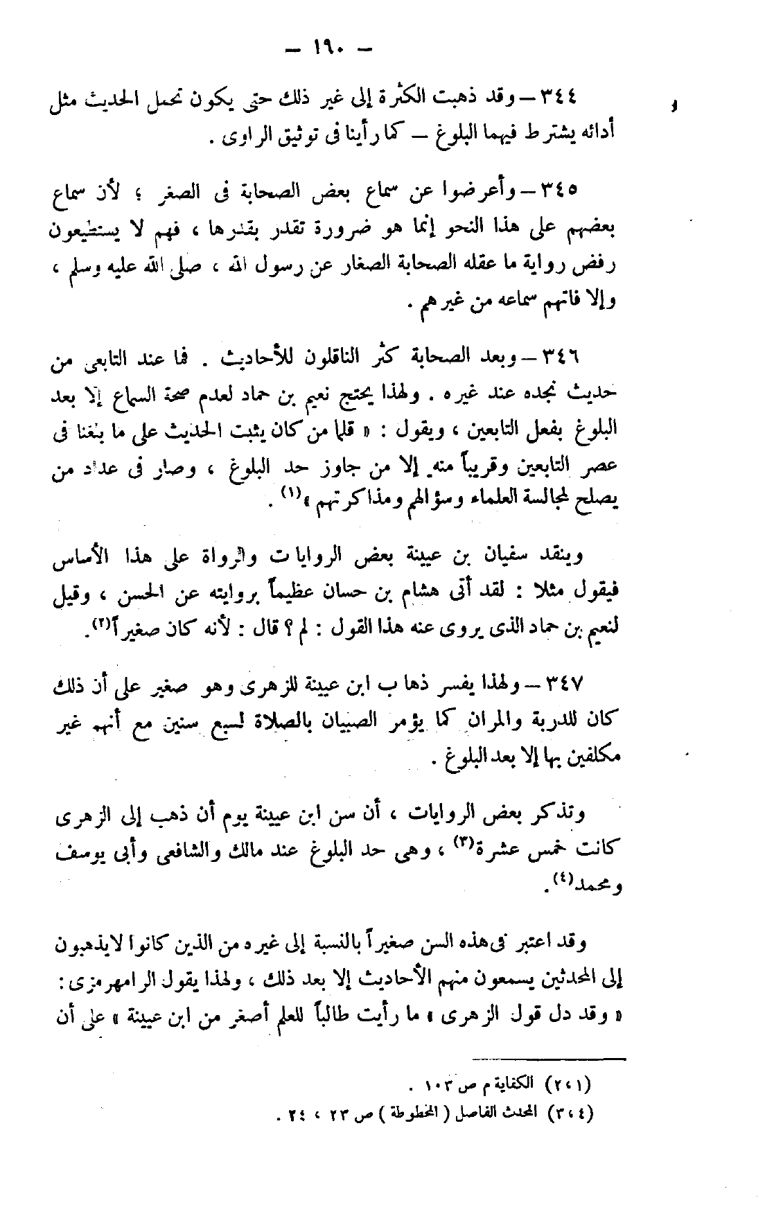 345- وأعرضوا عن سماع بعض الصحابة في الصغير؛ لأن سماع بعضهم على هذا النحو إنما هو ضرورة تقدر بقدرها، فهم لا يستطيعون رفض رواية ما عقله الصحابة الصغار عن رسول الله، صلى الله عليه وسلم، وإلا فاتهم سماعه من غيرهم.