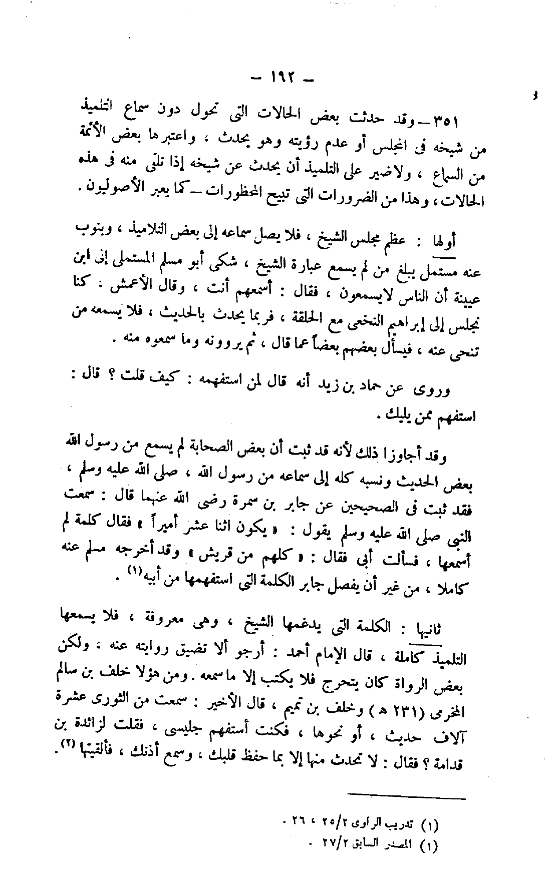351- وقد حدثت بعض الحالات التي تحول دون سماع التلميذ من شيخه في المجلس أو عدم رؤيته وهو يحدث، واعتبرها بعض الأئمة من السماع، ولا ضير على التلميذ أن يحدث عنه شيخه إذا تلقى منه في هذه الحالات، وهذا من الضرورات التي تبيح المحظورات -كما يعبر الأصوليون.