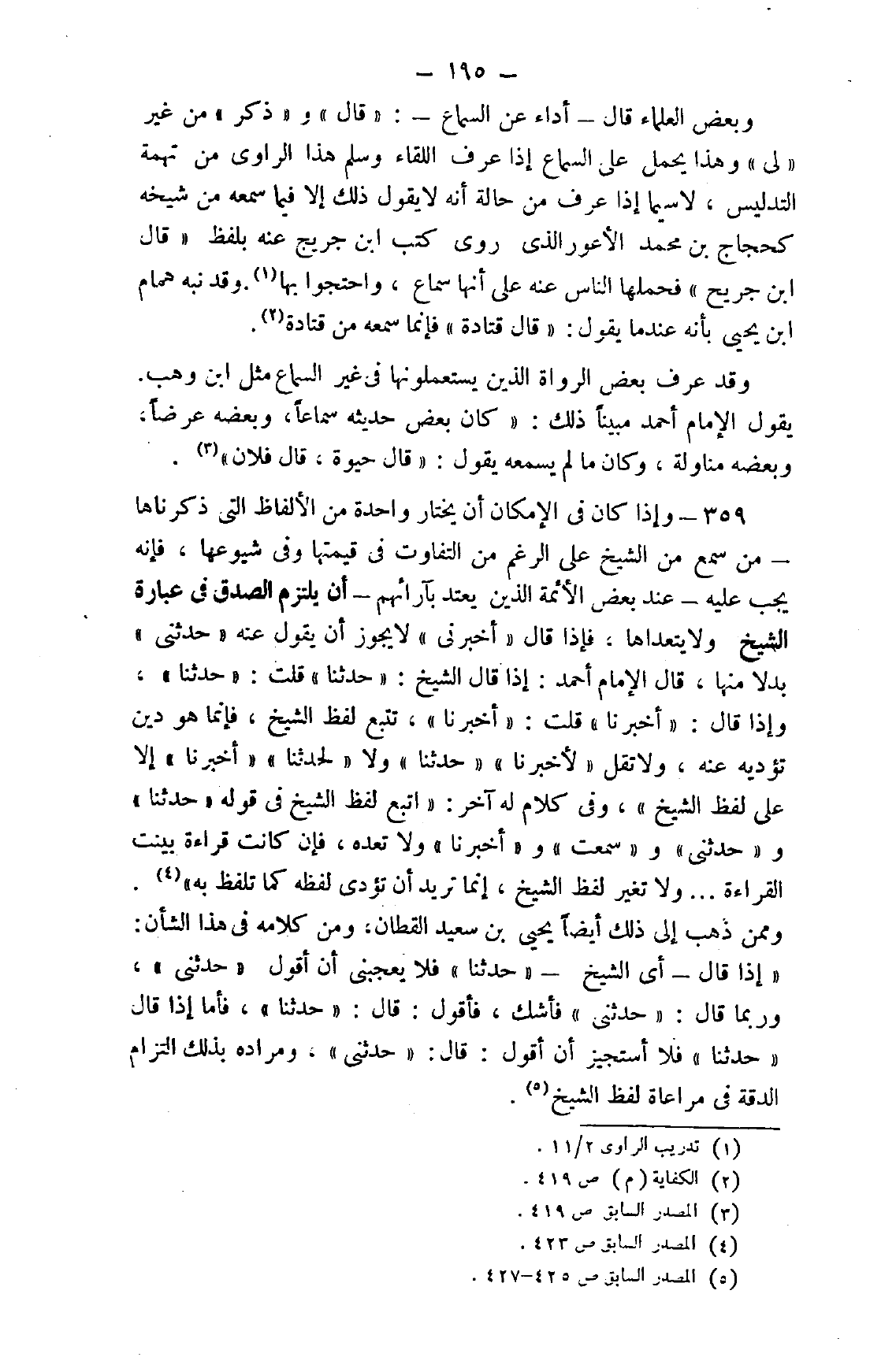 وممن ذهب إلى ذلك أيضًا يحيى بن سعيد القطان، ومن كلامه في هذا الشأن: "إذا قال -أي الشيخ- "حدثنا" فلا يعجبني أن أقول"حدثني"، وربما قال: "حدثني" فأشك، فأقول: قال: "حدثنا"، فأما إذا قال "حدثنا" فلا أستجيز أن أقول: قال: "حدثني"، ومراده بذلك التزام الدقة في مراعاة لفظ الشيخ5.