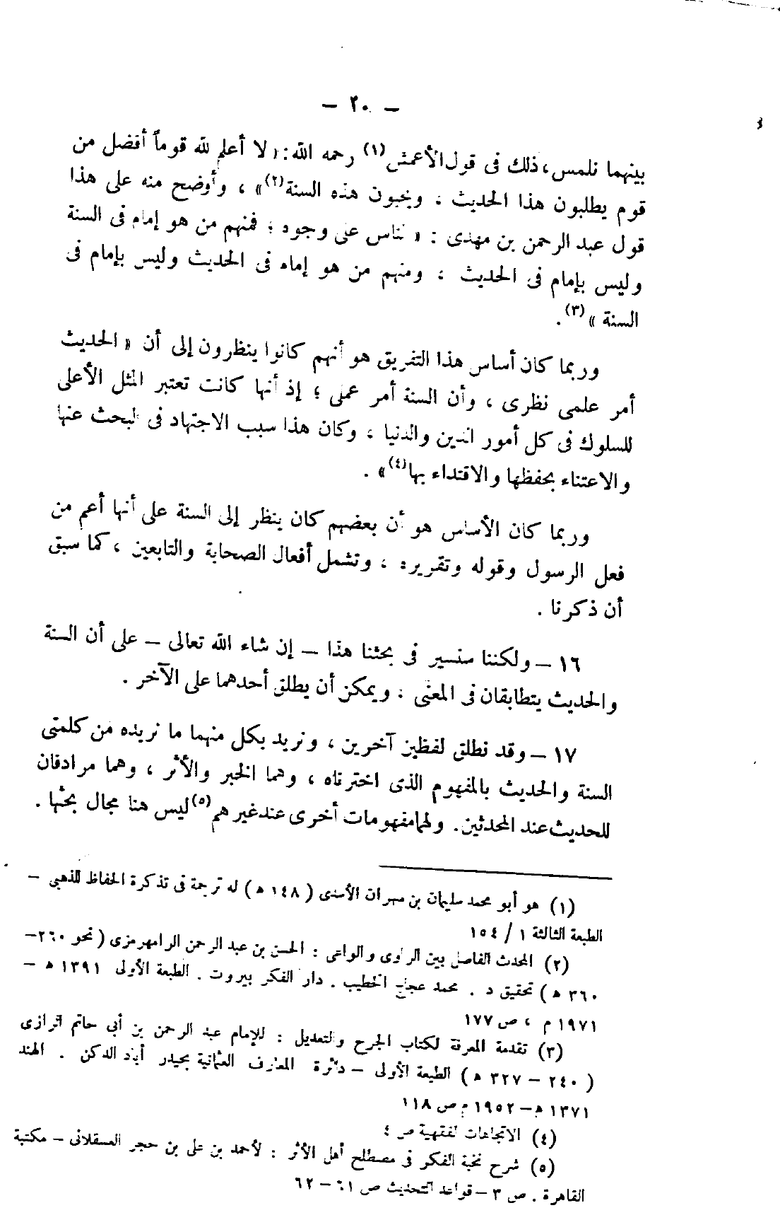 17- وقد نطلق لفظين آخرين، ونريد بكل منهما ما نريده من كلمتي السنة والحديث بالمفهوم الذي اخترناه، وهما الخبر والأثر، وهما مرادفان للحديث عند المحدثين، ولهما مفهومات أخرى عند غيرهم5 ليس هنا مجال بحثها.