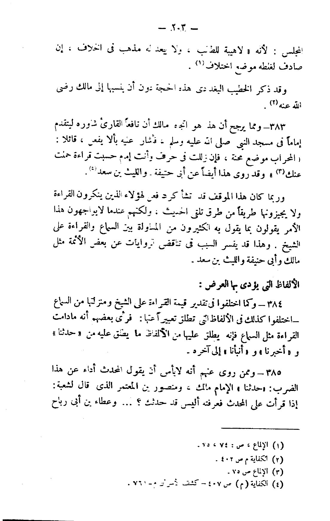 385- وممن روى عنهم أنه لا بأس أن يقول المحدث أداء عن هذا الضرب: "حدثنا" الإمام مالك، ومنصور بن المعتمر الذي قال لشعبة: إذا قرأت على المحدث فعرفته أليس قد حدثك؟ ... وعطاء بن أبي رباح