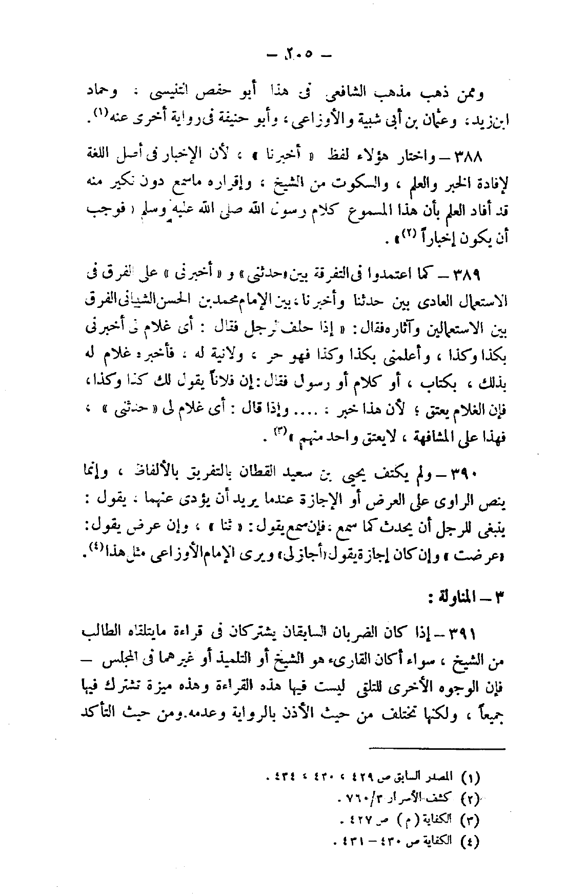 390- ولم يكتف يحيى بن سعيد القطان بالتفريق بالألفاظ، وإنما ينص الراوي على العرض أو الإجازة يريد أن يؤدي عنهما، يقول: ينبغي للرجل أن يحدث كما سمع، فإن سمع يقول: "ثنا"، وإن عرض يقول: "عرضت" وإن كان إجازة يقول "أجاز لي" ويرى الإمام الأوزاعي مثل هذا 4.