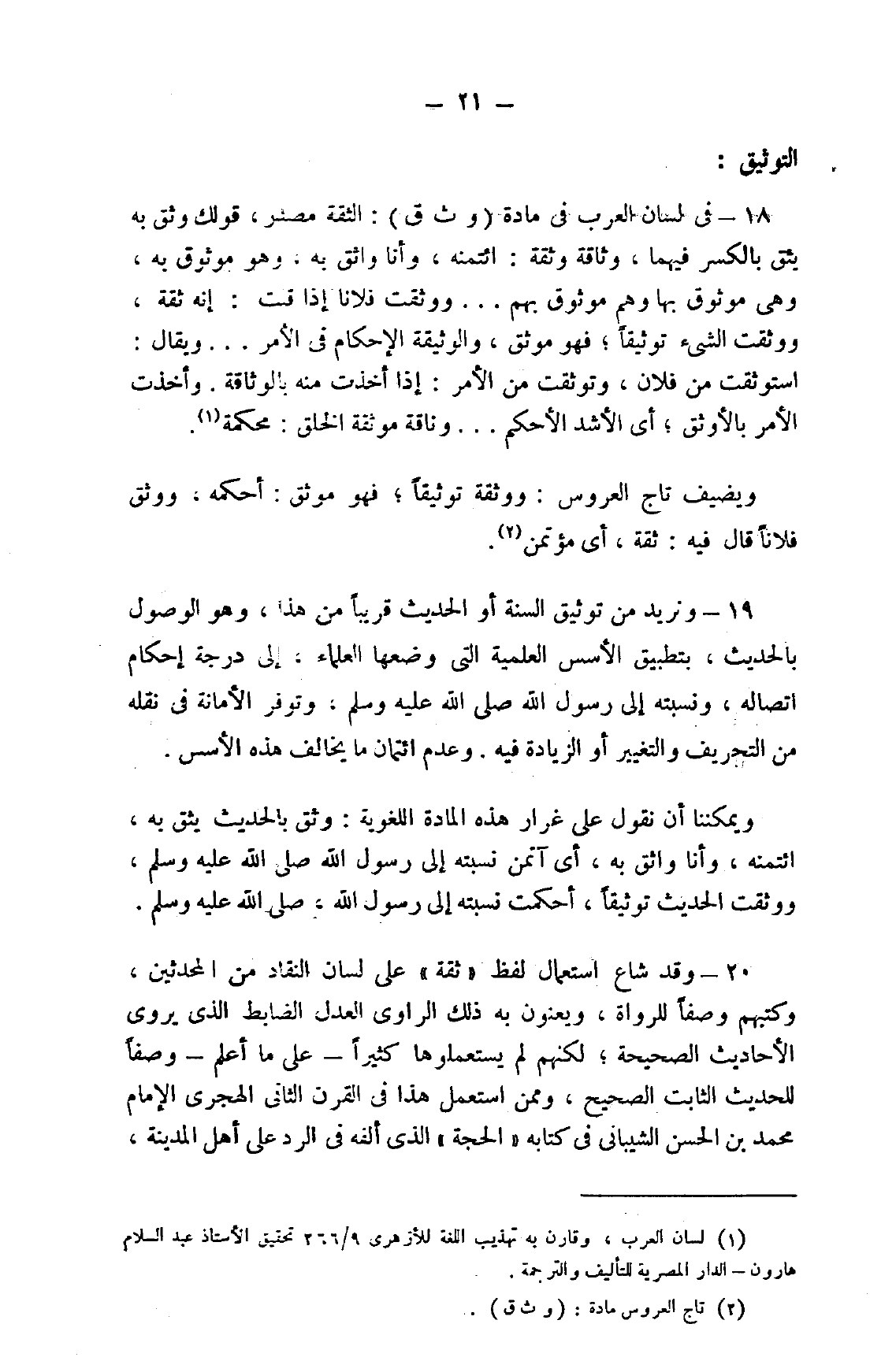 19- ونريد من توثيق السنة أو الحديث قريبًا من هذا، وهو الوصول بالحديث، بتطبيق الأسس العلمية التي وضعها العلماء، إلى درجة إحكام اتصاله، ونسبته إلى رسول الله صلى الله عليه وسلم، وتوفر الأمانة في نقله من التحريف والتغيير أو الزيادة فيه. وعدم ائتمان ما يخالف هذه الأسس.