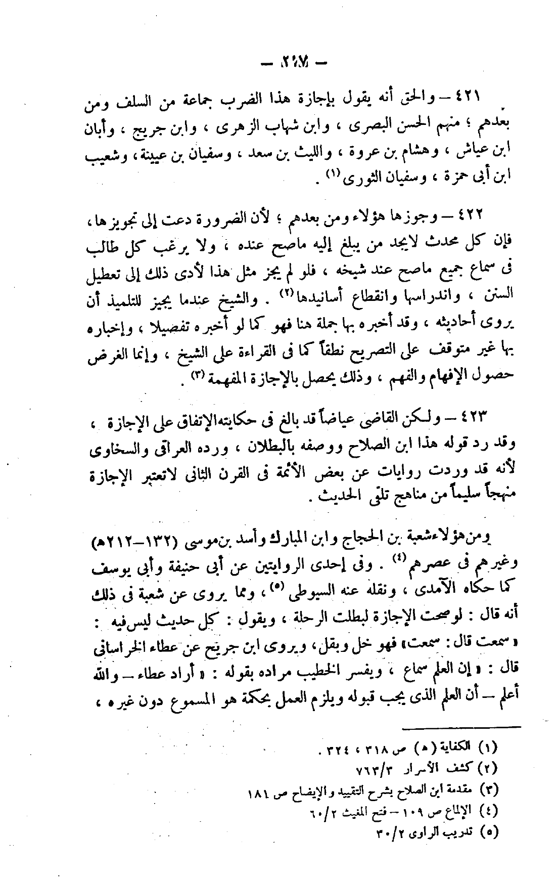 423- ولكن القاضي عياضًا قد بالغ في حكايته الاتفاق على الإجازة، وقد رد قوله هذا ابن الصلاح ووصفه بالبطلان، ورده العراقي والسخاوي لأنه قد وردت روايات عن بعض الأئمة في القرن الثاني لا تعتبر الإجازة منهجًا سليمًا من مناهج تلقي الحديث.