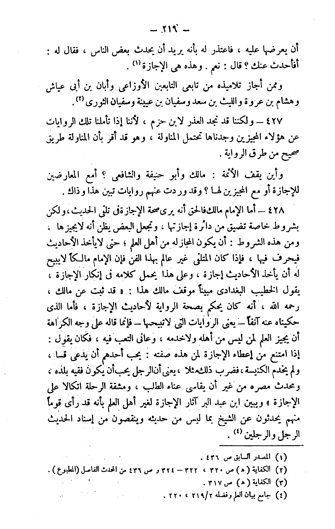 427- ولكننا قد نجد العذر لابن حزم، لأننا إذا تأملنا تلك الروايات عن هؤلاء المجيزين وجدناها تحتمل المناولة، وهو قد أقر بأن المناولة طريق صحيح من طرق الرواية.
