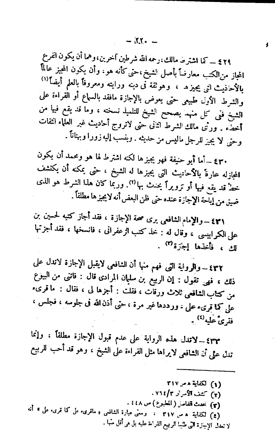 4 الكفاية هـ ص 317، ومعنى عبارة الشافعي "ما قرئ على كما قرئ على" أنه لا تعدل الإجازة التي طلبها الربيع القراءة عليه بل هي أقل منها.
