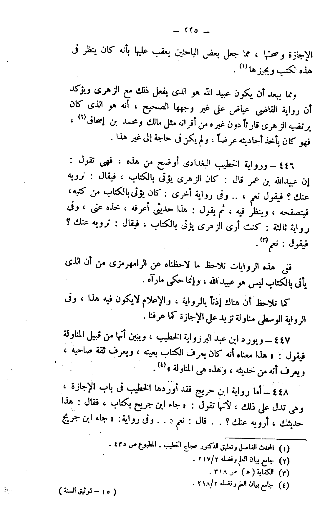 448- أما رواية ابن حريج فقد أوردها الخطيب في باب الإجازة، وهي تدل على ذلك، لأنها تقول: "جاء ابن جريح بكتاب، فقال: هذا حديثك، أرويه عنك؟ ... قال: نعم " ... وفي رواية: "جاء ابن جريج