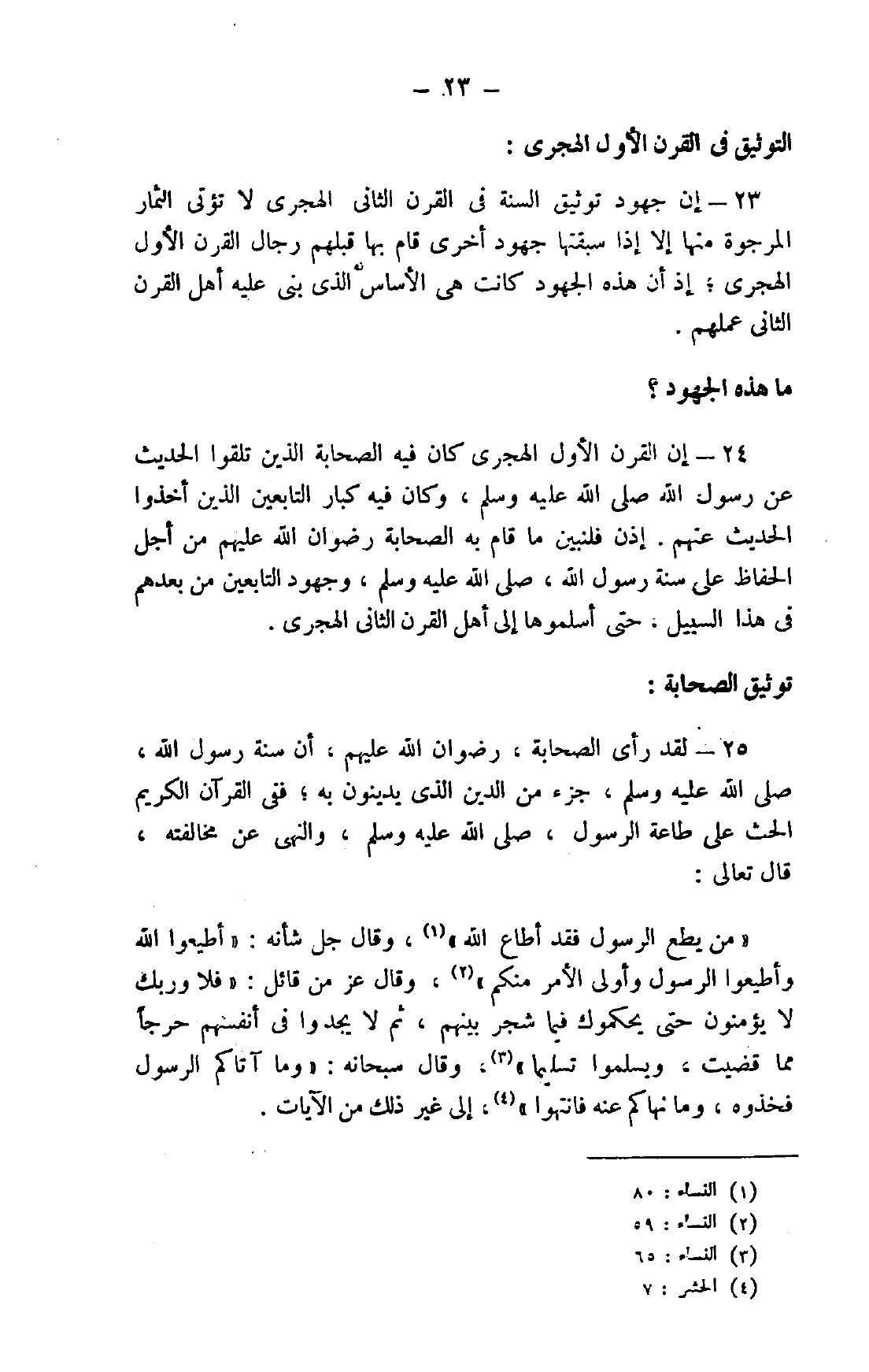 24- إن القرن الأول الهجري كان فيه الصحابة الذين تلقوا الحديث عن رسول الله صلى الله عليه وسلم، وكان فيه كبار التابعين الذين أخذوا الحديث عنهم. إذن فلنبين ما قام به الصحابة رضوان الله عليهم من أجل الحفاظ على سنة رسول الله، صلى الله عليه وسلم، وجهود التابعين من بعدهم في هذا السبيل، حتى أسلموهها إلى أهل القرن الثاني الهجري.