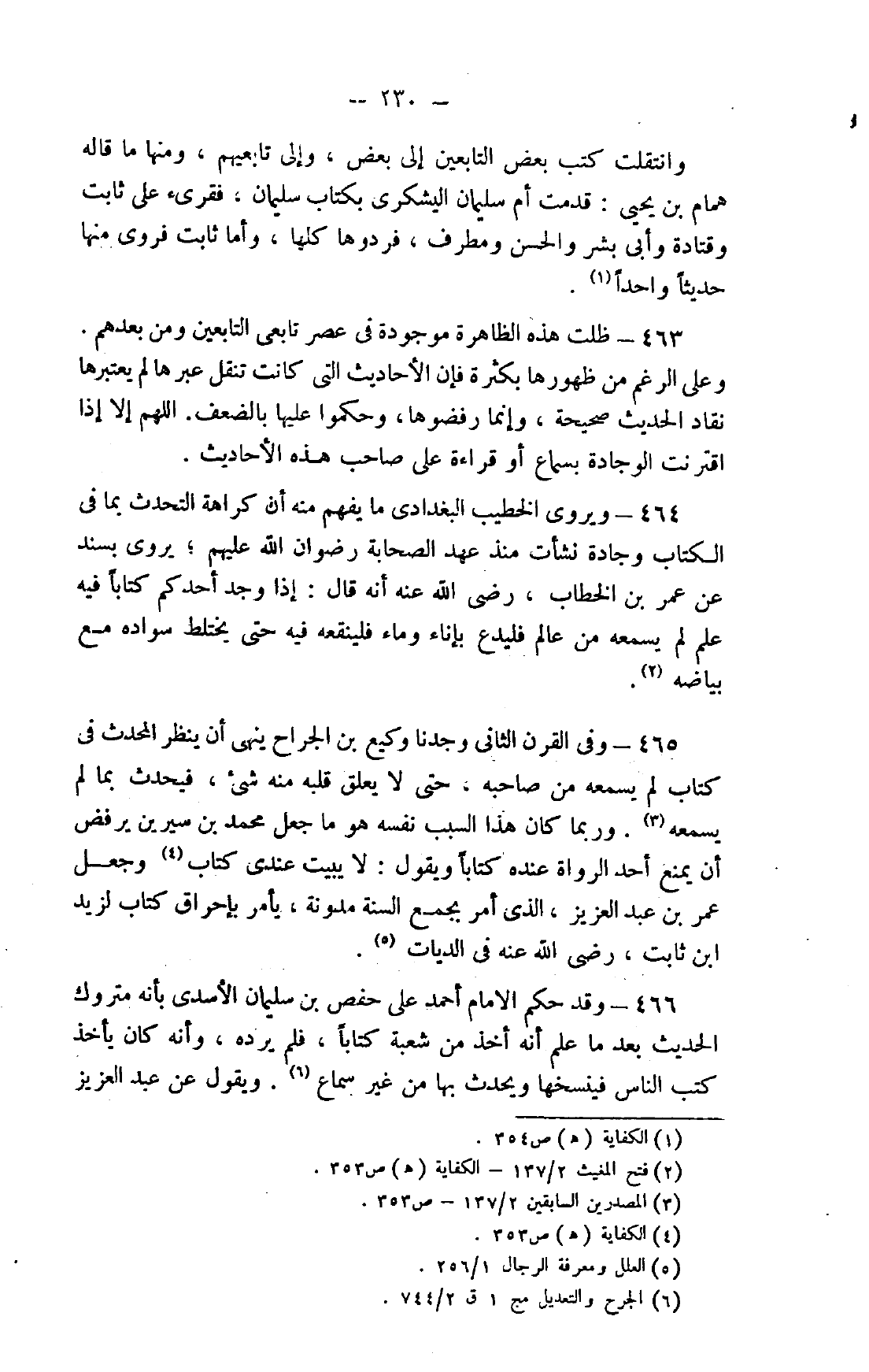 464- ويروي الخطيب البغدادي ما يفهم منه أن كراهة التحدث بما في الكتاب وجادة نشأت منذ عهد الصحابة رضوان الله عليهم؛ يروى بسند عن عمر بن الخطاب، رضي الله عنه أنه قال: "إذا وجد أحدكم كتابًا فيه علم لم يسمعه من عالم فليدع بإناء وماء فلينقعه فيه حتى يختلط سواده مع بياضه2.