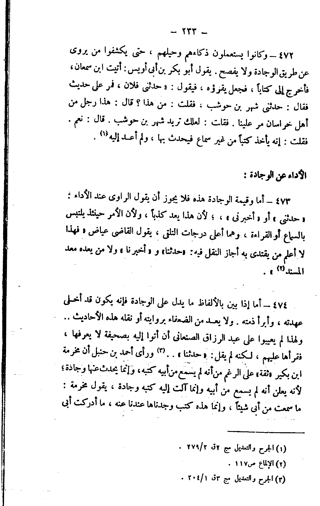 473- أما وقيمة الوجادة هذه فلا تجوز أن يقول الراوي عند الأداء: "حدثني" أو "أخبرني"؛ لأن هذا يعد كذبًا، ولأن الأمر حينئذ يلتبس بالسماع أو القراءة، وهما أعلى درجات التلقي، يقول القاضي عياض: "فهذا لا أعلم من يقتدي به أجاز النقل فيه: "حدثنا" و"أخبرنا" ولا من يعده معد المسند"2.