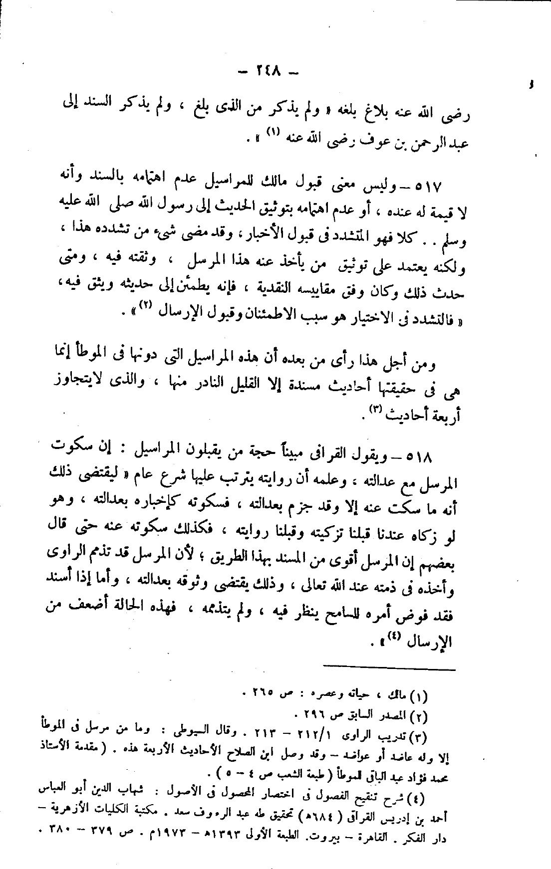 3 تدريب الراوي 1/ 212 - 213. وقال السيوطي: وما من مرسل في الموطأ إلا وله عاضد أو عواضد - وقد وصل ابن الصلاح الأحاديث الأربعة هذه. "مقدمة الأستاذ محمد فؤاد عبد الباقي للموطأ "طبعة الشعب ص 4- 5".