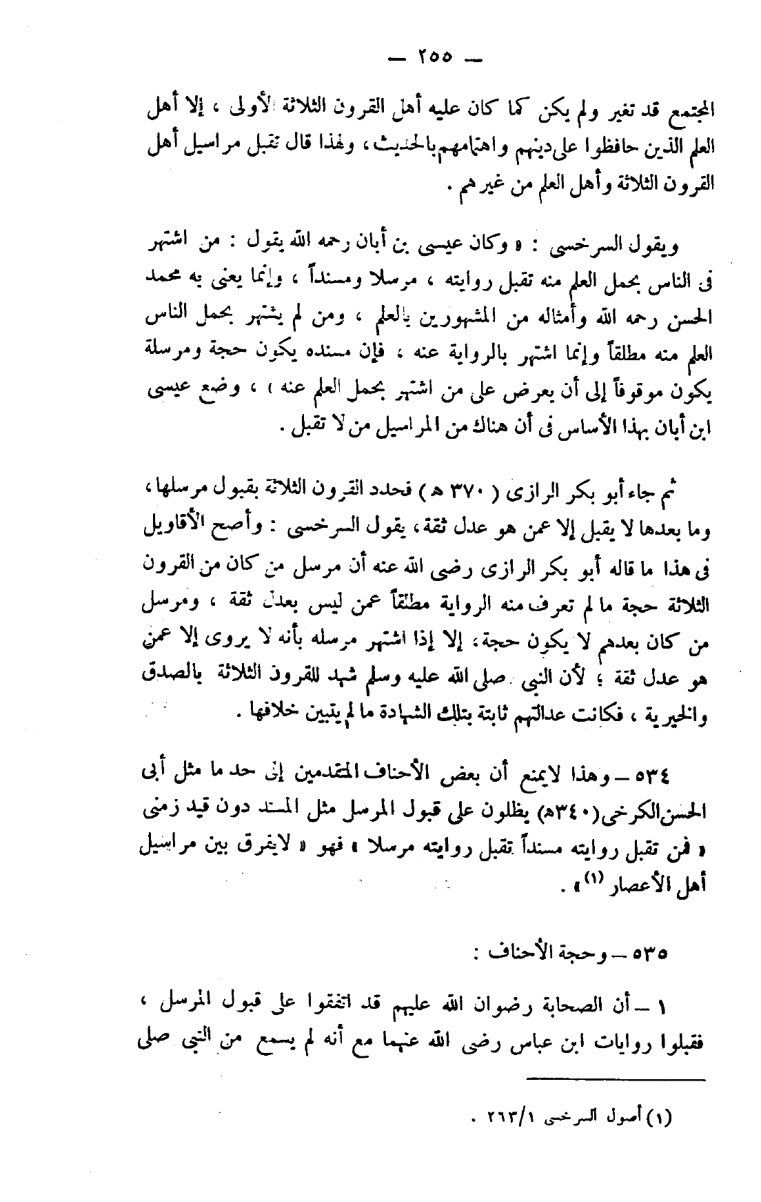 534- وهذا لا يمنع أن بعض الأحناف المتقدمين إلى حد ما مثل أبي الحسن الكرخي "340 هـ" يظلون على قبول المرسل مثل المسند دون قيد زمني "فمن تقبل روايته مسندًا تقبل روايته مرسلًا" فهو "لا يفرق بين مراسيل أهل الأعصار"1.