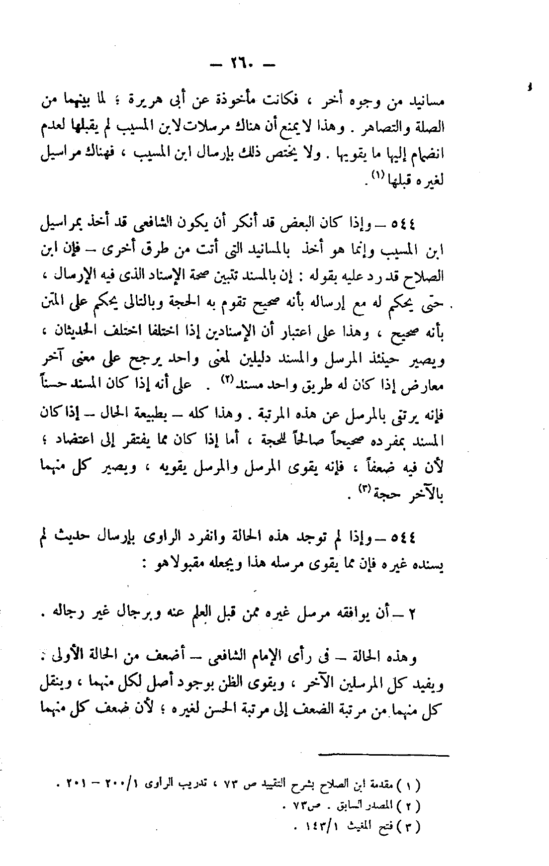 544- وإذا كان البعض قد أنكر أن يكون الشافعي قد أخذ بمراسيل ابن المسيب وإنما هو أخذ بالمسانيد التي أتت من طرق أخرى؛ فإن ابن الصلاح قد رد عليه بقوله: إن بالمسند تتبين صحة الإسناد الذي فيه الإرسال، حتى يحكم له مع إرساله بأنه صحيح تقوم به الحجة وبالتالي يحكم على المتن بأنه صحيح، وهذا على اعتبار أن الإسنادين إذا اختلفا اختلف الحديثان، ويصير حينئذ المرسل والمسند دليلين لمعنى واحد يرجح على معنى آخر معارض إذا كان له طريق واحد مسند2.