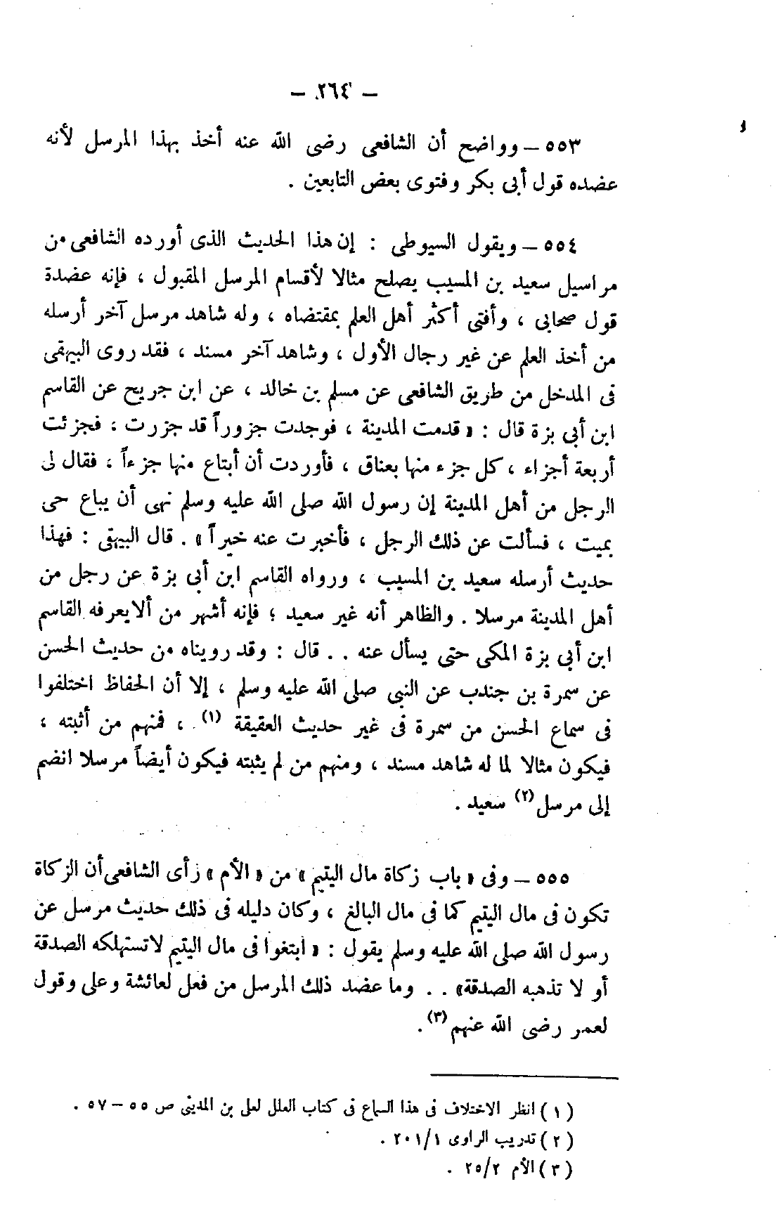 554- ويقول السيوطي: إن هذا الحديث الذي أورده الشافعي من مراسيل سعيد بن المسيب يصلح مثالًا لأقسام المرسل المقبول، فإنه عضده قول صحابي، وأفتى أكثر أهل العلم بمقتضاه، وله شاهد مرسل آخر أرسله من أخذ العلم عن غير رجال الأول، وشاهد آخر مسند، فقد روى البيهقي في المدخل من طريق الشافعي عن مسلم بن خالد، عن ابن جريح عن القاسم ابن أبي بزة قال: "قدمت المدينة، فوجدت جزورًا قد جزرت، فجزئت أربعة أجزاء، كل جزء منها بعناق، فأردت أن أبتاع منها جزءًا، فقال لي الرجل من أهل المدينة: إن رسول الله صلى الله عليه وسلم نهى أن يباع حي بميت، فسألت عن ذلك الرجل، فأخبرت عنه خيرًا".