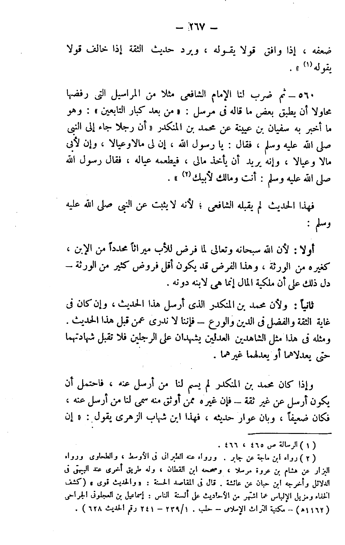 560- ثم ضرب لنا الإمام الشافعي مثلًا من المراسيل التي رفضها محاولًا أن يطبق بعض ما قاله في مرسل: "من بعد كبار التابعين": وهو ما أخبر به سفيان بن عيينة عن محمد بن المنكدر "أن رجلًا جاء إلى النبي صلى الله عليه وسلم، فقال: يا رسول الله، إن لي مالًا وعيالًا، وإن لأبي مالًا وعيالًا، وإنه يريد أن يأخذ مالي، فيطعمه عياله، فقال رسول الله صلى الله عليه وسلم: "أنت ومالك لأبيك" 2.