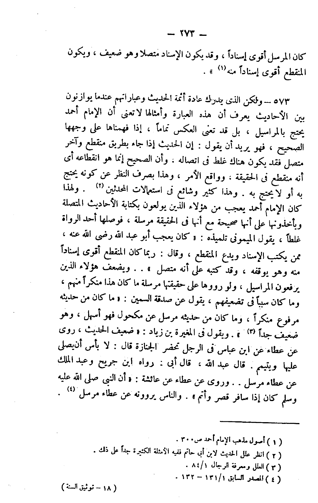 573- ولكن الذي يدرك عادة أئمة الحديث وعباراتهم عندما يوازنون بين الأحاديث يعرف أن هذه العبارة وأمثالها لا تعني أن الإمام أحمد يحتج بالمراسيل، بل قد تعني العكس تمامًا، إذا فهمناها على وجهها الصحيح، فهو يريد أن يقول: إن الحديث إذا جاء بطريق منقطع وآخر متصل فقد يكون هناك غلط في اتصاله، وأن الصحيح إنما هو انقطاعه أي أنه منقطع في الحقيقة، وواقع الأمر، وهذا بصرف النظر عن كونه يحتج به أو لا يحتج به. وهذا كثير وشائع في استعمالات المحدثين2. ولهذا كان الإمام أحمد يعجب من هؤلاء الذين يولعون بكتابة الأحاديث المتصلة ويأخذونها على أنها صحيحة مع أنها في الحقيقة مرسلة، فوصلها أحد الرواة غلطًا، يقول الميموني تلميذه: "كان يعجب أبو عبد الله رضي الله عنه، ممن يكتب الإسناد ويدع المنقطع، وقال: ربما كان المنقطع أقوى إسنادًا منه وهو يوقفه، وقد كتبه على أنه متصل".. ويضعف هؤلاء الذين يرفعون المراسيل، ولو رووها على حقيقتها مرسلة ما كان هذا منكرًا منهم، وما كان سببًا في تضعيفهم، يقول عن صدقة السمين: "ما كان من حديثه مرفوع منكرًا، وما كان من حديثه مرسل عن مكحول فهو أسهل، وهو ضعيف جدًّا"3. ويقول في المغيرة بن زياد: "ضعيف الحديث، روي عن عطاء عن ابن عباس في الرجل تحضر الجنازة قال: لا بأس أن يصلي عليها ويتيمم. قال عبد الله، قال أبي: رواه ابن جريح وعبد الملك عن عطاء مرسل.. وروي عن عطاء عن عائشة: "أن النبي صلى الله عليه وسلم كان إذا سافر قصر وأتم". والناس يروونه عن عطاء مرسل4.