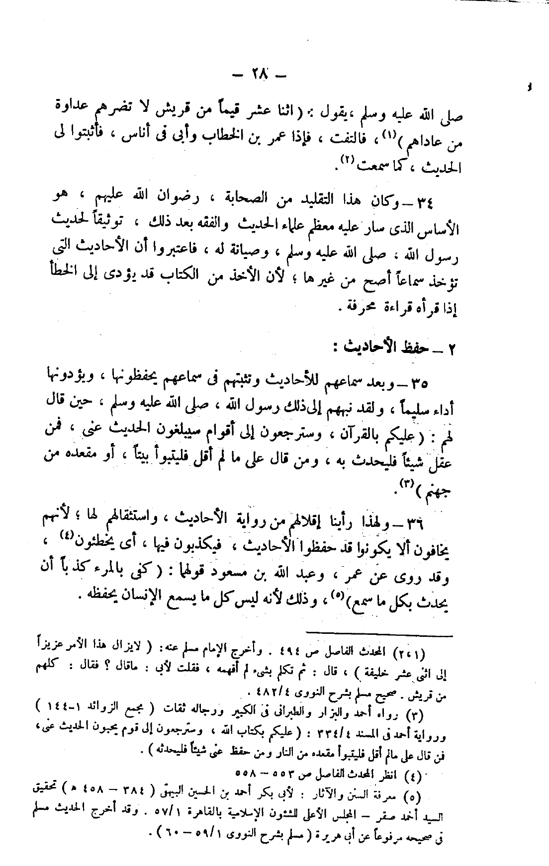 34- وكان هذا التقليد من الصحابة، رضوان الله عليهم، هو الأساس الذي سار عليه معظم علماء الحديث والفقه بعد ذلك، توثيقًا لحديث رسول الله، صلى الله عليه وسلم، وصيانة له، فاعتبروا أن الأحاديث التي تؤخذ سماعًا أصح من غيرها؛ لأن الأخذ من الكتاب قد يؤدي إلى الخطأ إذا قرأه قراءة محرفة.