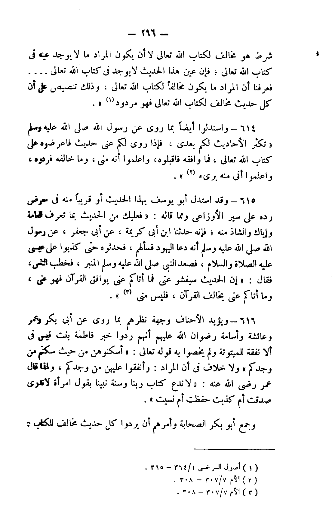 615- وقد استدل أبو يوسف بهذا الحديث أو قريبًا منه في معرض رده على سير الأوزاعي ومما قاله: "فعليك من الحديث بما تعرف العامة وإياك والشاذ منه؛ فإنه حدثنا ابن أبي كريمة، عن أبي جعفر، عن رسول الله صلى الله عليه وسلم أنه دعا اليهود فسألهم، فحدثوه حتى كذبوا على عيسى عليه الصلاة والسلام، فصعد النبي صلى الله عليه وسلم المنبر، فخطب الناس، فقال: "إن الحديث سيفشو عني فما أتاكم عني يوافق القرآن فهو عني، وما أتاكم عني يخالف القرآن، فليس مني" 3.