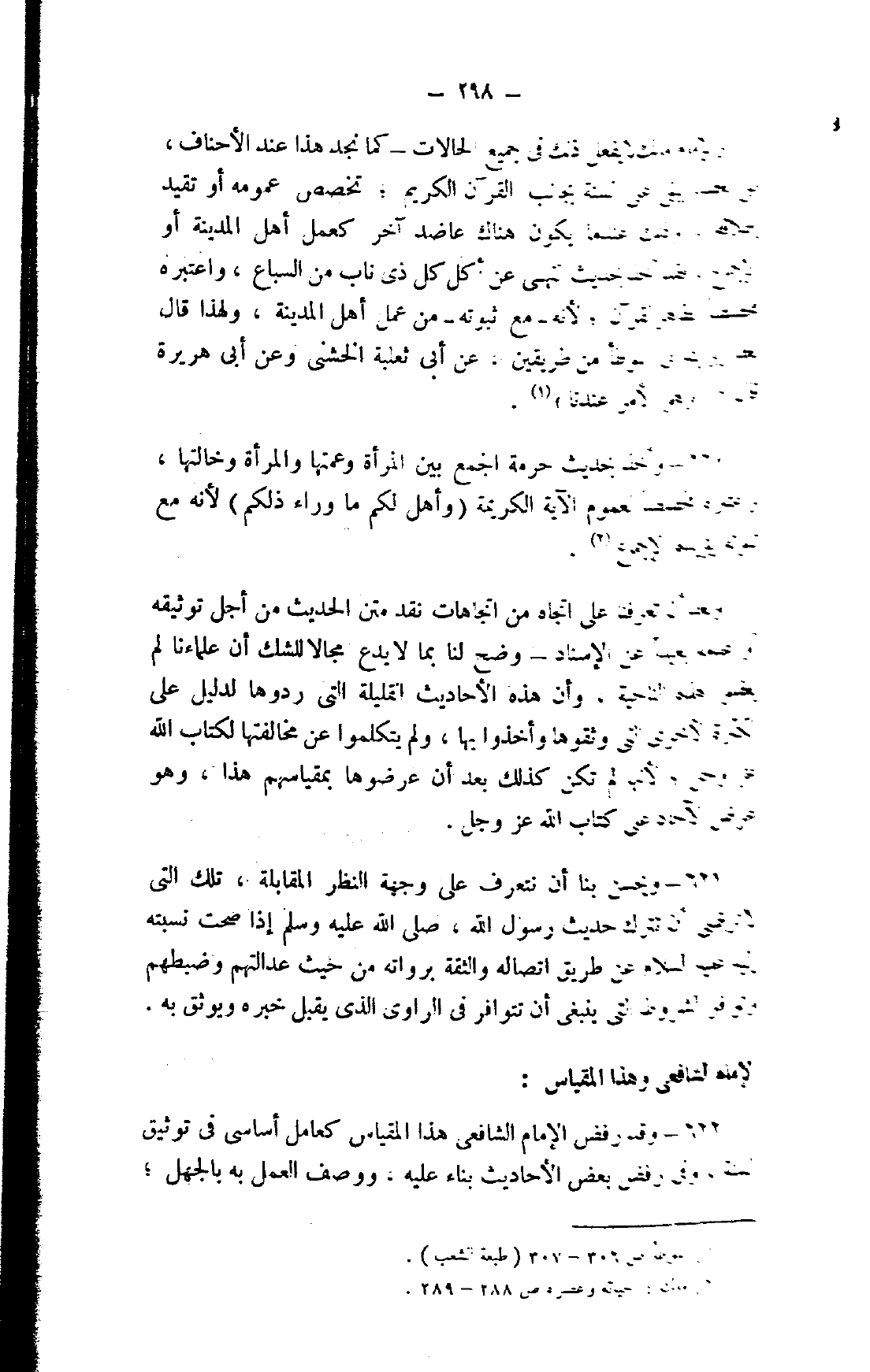 622- وقد رفض الإمام الشافعي هذا المقياس كعامل أساسي في توثيق السنة، وفي رفض بعض الأحاديث بناء عليه، ووصف العمل به بالجهل؛