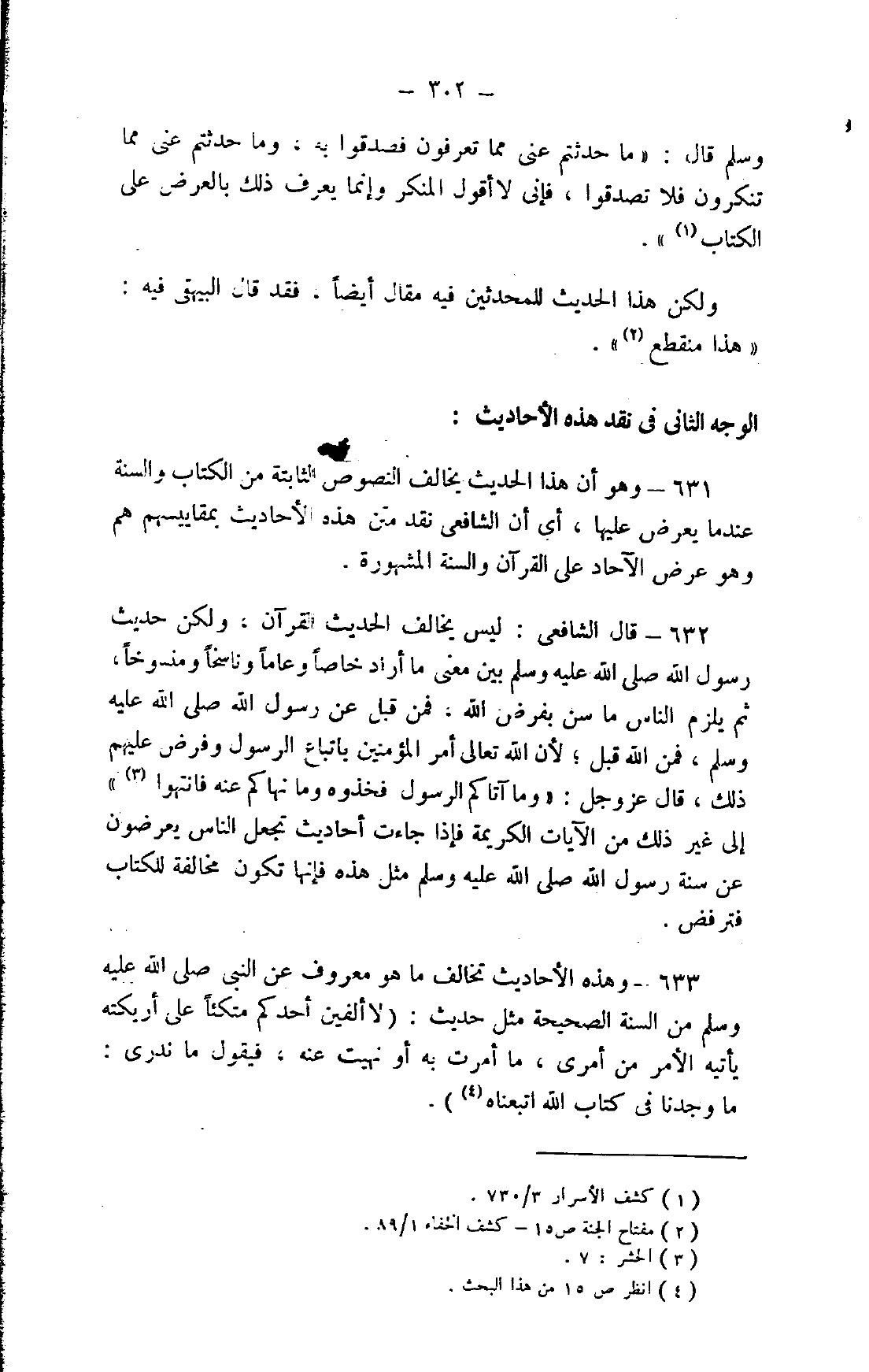 633- وهذه الأحاديث تخالف ما هو معروف عن النبي صلى الله عليه وسلم من السنة الصحيحة مثل حديث: "لا ألفين أحدكم متكئًا على أريكته يأتيه الأمر من أمري، ما أمرت به أو نهيت عنه، فيقول ما ندري: ما وجدنا في كتاب الله اتبعناه" 4.