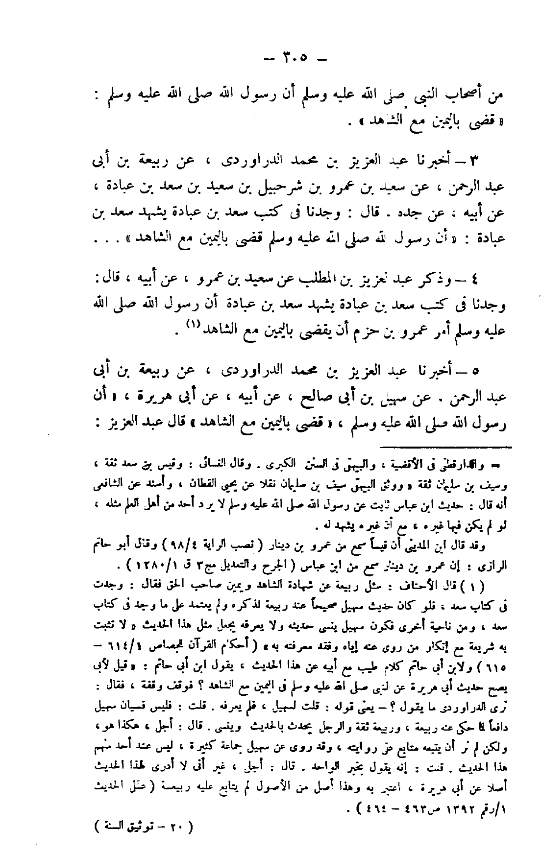 3- أخبرناعبد العزيز بن محمد الدراوردي، عن ربيعة بن أبي عبد الرحمن، عن سعيد بن عمرو بن شرحبيل بن سعيد بن سعد بن عبادة، عن أبيه، عن جده، قال: وجدنا في كتب سعد بن عبادة يشهد سعد بن عبادة: "أن رسول الله صلى الله عليه وسلم قضى باليمين مع الشاهد" ...