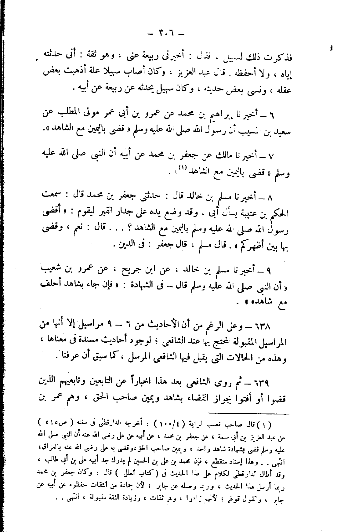 8- أخبرنا مسلم بن خالد قال: حدثني جعفر بن محمد قال: سمعت الحكم بن عتيبة يسأل أبي، وقد وضع يده على جدار القبر ليقوم: "أقضى رسول الله صلى الله عليه وسلم باليمين مع الشاهد؟ ... قال: نعم، وقضى بها بين أظهركم". قال مسلم، قال جعفر: في الدين.