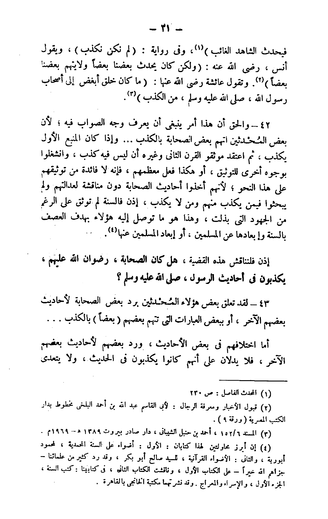 42- والحق أن هذا أمر ينبغي أن يعرف وجه الصواب فيه؛ لأن بعض المحدثين اتهم بعض الصحابة بالكذب ... وإذا كان المنبع الأول يكذب، ثم اعتقد موثقوا القرن الثاني وغيره أن ليس فيه كذب، وانشغلوا بوجوه أخرى للتوثيق، أو هكذا فعل معظمهم، فإنه لا فائدة من توثيقهم على هذا النحو؛ لأنهم أخذوا أحاديث الصحابة دون مناقشة لعدالتهم ولم يبحثوا فيمن يكذب منهم ومن لا يكذب، إذن فالسنة لم توثق على الرغم من الجهود التي بذلت، وهذا هو ما توصل إليه هؤلاء بهدف العصف بالسنة وإبعادها عن المسلمين، أو إبعاد المسلمين عنها4.