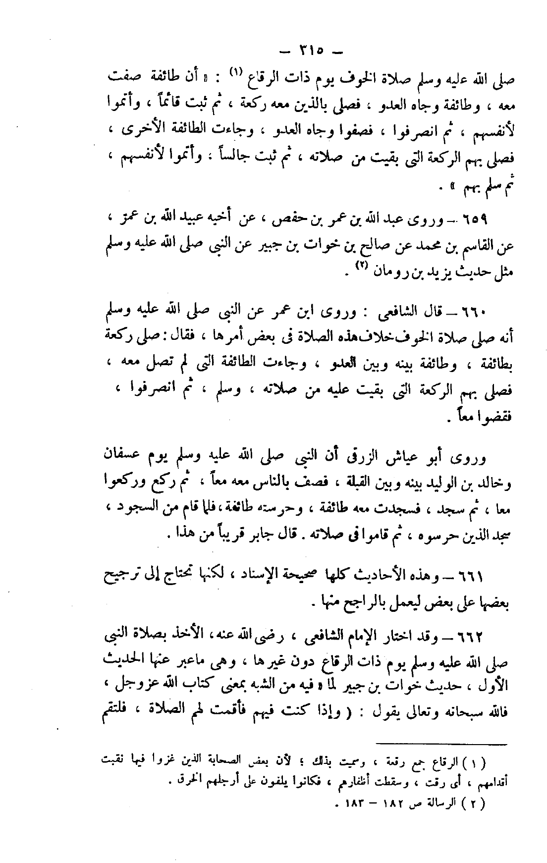 662- وقد اختار الإمام الشافعي، رضي الله عنه، الأخذ بصلاة النبي صلى الله عليه وسلم يوم ذات الرقاع دون غيرها، وهي ما عبر عنها الحديث الأول، حديث خوات بين جبير لما "فيه من الشبه بمعنى كتاب الله عز وجل، فالله سبحانه وتعالى يقول: {وَإِذَا كُنْتَ فِيهِمْ فَأَقَمْتَ لَهُمُ الصَّلاةَ فَلْتَقُمْ