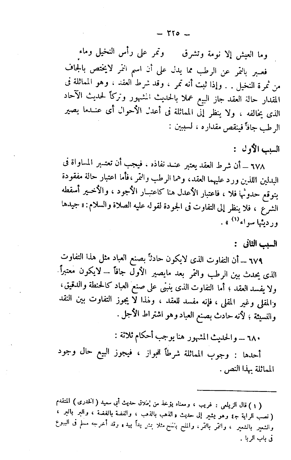 678- أن شرط العقد يعتبر عند نفاذه، فيجب أن تعتبر المساواة في البدلين اللذين ورد عليهما العقد، وهما الرطب والتمر، فأما اعتبار حالة مفقودة يتوقع حدوثها فلا، فاعتبار الأعدل هنا كاعتبار الأجود، والأخير أسقطه الشرع، فلا ينظر إلى التفاوت في الجودة لقوله عليه الصلاة والسلام: "جيدها ورديئها سواء" 1.