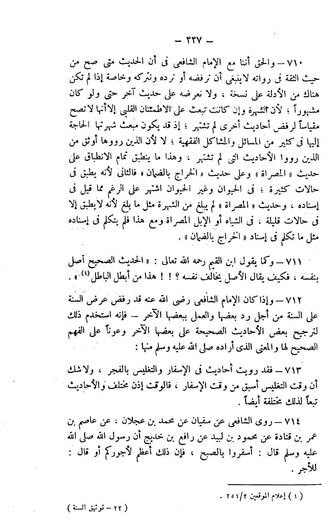 711- وكما يقول ابن القيم رحمه الله تعالى: "الحديث الصحيح أصل بنفسه، فكيف يقال: الأصل يخالف نفسه؟!! هذا من أبطل الباطل"1.