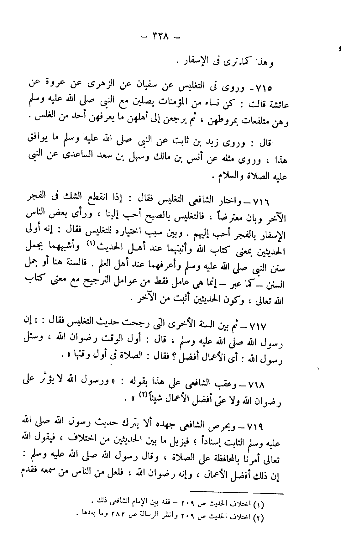 719- ويحرص الشافيع جهده ألا يترك حديث رسول الله صلى الله عليه وسلم الثابت إسنادًا؛ فيزيل ما بين الحديثين من اختلاف، فيقول الله تعالى أمرنا بالمحافظة على الصلاة، وقال رسول الله صلى الله عليه وسلم: إن ذلك أفضل الأعمال، وإنه رضوان الله، فلعل من الناس من سمعه فقدم