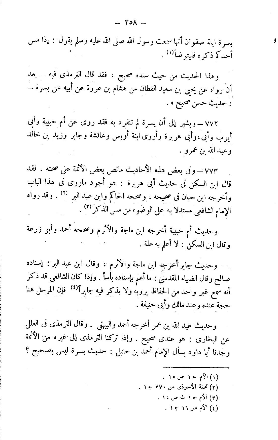 وحديث عبد الله بن عمر أخرجه أحمد والبيهقي. وقال الترمذي في العلل عن البخاري: هو عندي صحيح. وإذا تركنا الترمذي إلى غيره من الأئمة وجدنا أبا داود يسأل الإمام أحمد بن حنبل: حديث بسرة ليس بصحيح؟