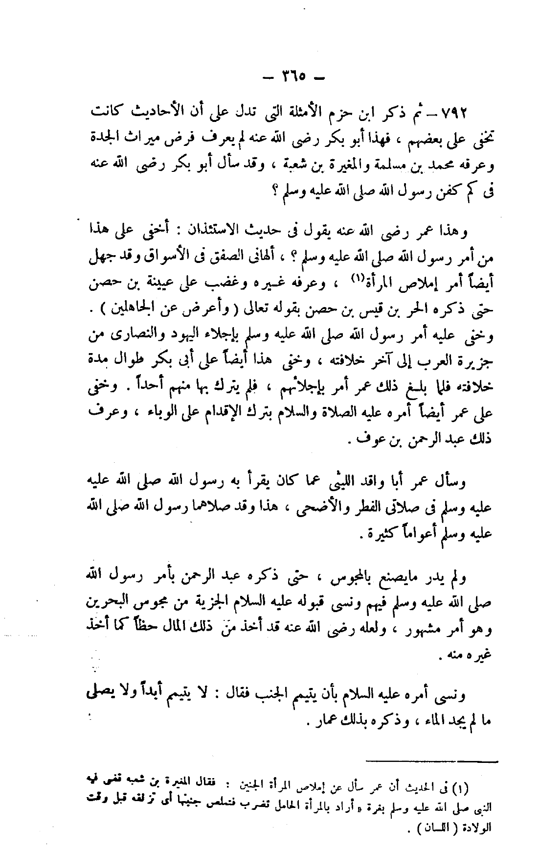 792- ثم ذكر ابن حزم الأمثلة التي تدل على أن الأحاديث كانت تخفي على بعضم، فهذا أبو بكر رضي الله عنه لم يعرف فرض ميراث الجدة، وعرفه محمد بن مسلمة والمغيرة بن شعبة، وقد سأل أبو بكر رضي الله عنه في كم كفن رسول الله صلى الله عليه وسلم.