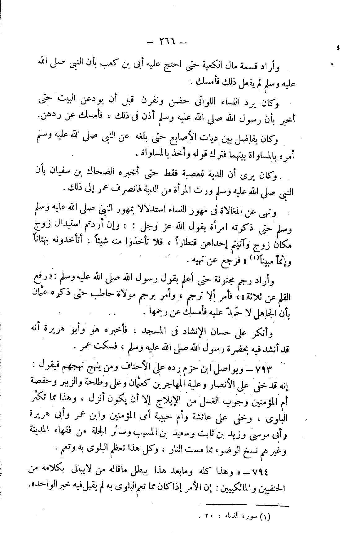 793- ويواصل ابن حزم رده على الأحناف ومن ينهج نهجهم فيقول: إنه قد خفي على الأنصار وعليه المهاجرين كعثمان وعلي وطلحة والزبير وحفصة أم المؤمنين وجوب الغسل من الإيلاج إلا أن يكون أنزل، وهذا مما تكثر البلوى، وخفي على عائشة وأم حبيبة أميّ المؤمنين وابن عمر وأبي هريرة وأبي موسى وزيد بن ثابت، وسعيد بن المسيب، وسائر الجلة من فقهاء المدينة وأبي موسى وزيد بن ثابت وسعيد بن المسيب وسائر الجلة من فقهاء المدينة وغيرهم نسخ الوضوء مما مست النار، وكل هذا تعظم البلوى به وتعم.