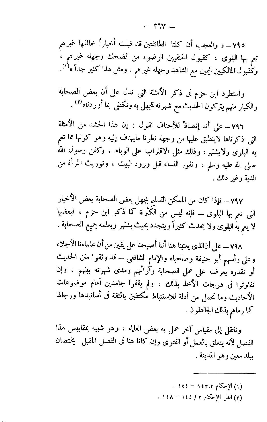 797- فإذا كان من الممكن التسليم بجهل بعض الصحابة بعض الأخبار التي تعم بها البلوى -فإنه ليس من الكثرة كما ذكر ابن حزم، فبعضها لا يعم به البلوى ولا يحدث كثيرًا ويتجدد بحيث يشتهر ويعلمه جميع الصحابة.
