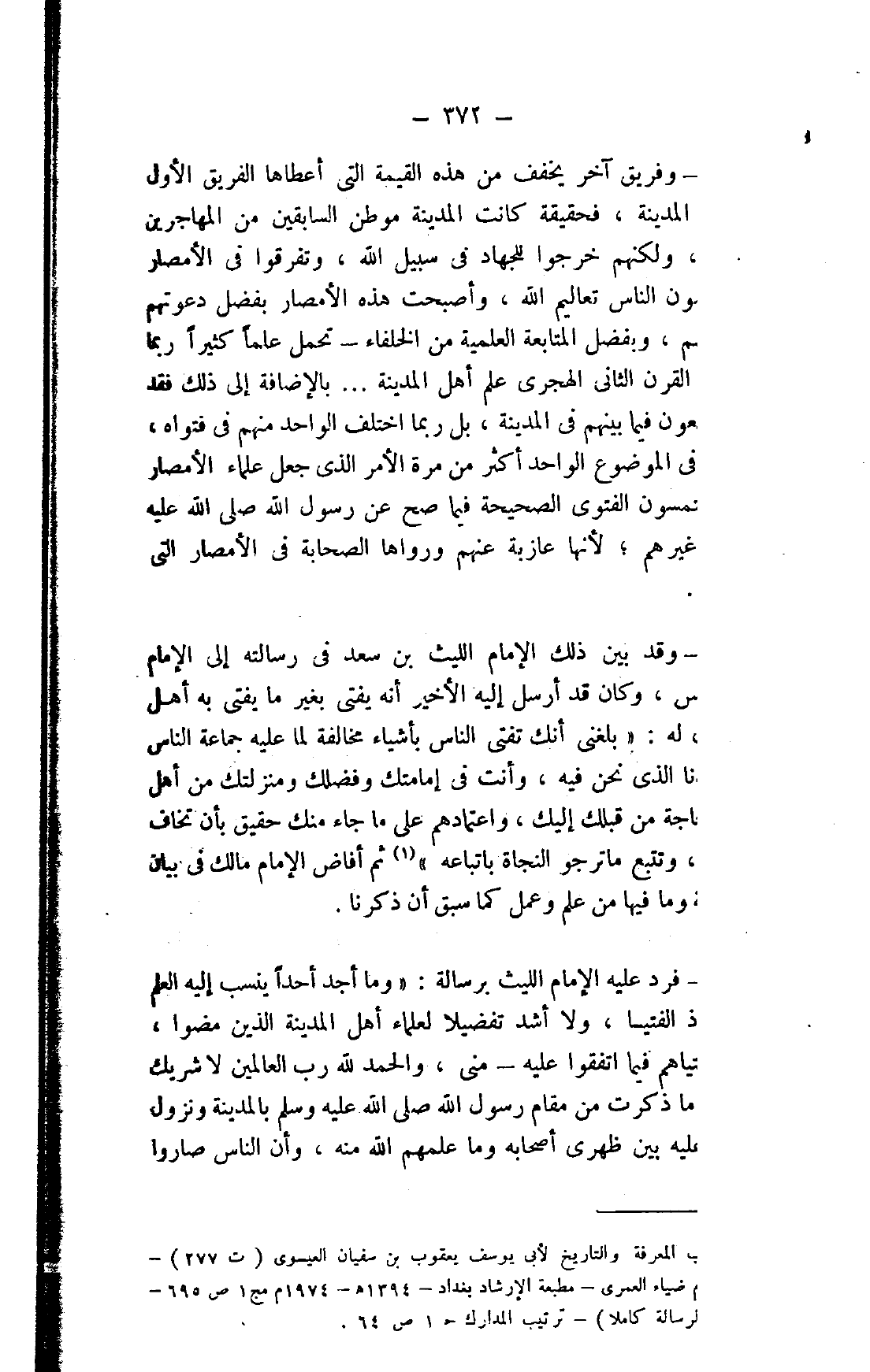 804- فرد عليه الإمام الليث برسالة: "وما أجد أحدًا ينسب إليه العلم أكره لشواذ الفتيا، ولا أشد تفضيلًا لعلماء أهل المدينة الذين مضوا، ولا آخذ بفتياهم فيما اتفقوا عليه -مني، والحمد لله رب العالمين لا شريك له ... وأما ما ذكرت من مقام رسول الله صلى الله عليه وسلم بالمدينة ونزول القرآن بها عليه بين ظهري أصحابه وما علمهم الله منه، وأن الناس صاروا