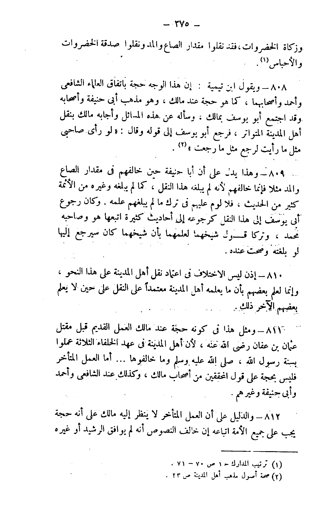 808- ويقول ابن تيمية: إن هذا الوجه حجة باتفاق العلماء الشافعي وأحمد وأصحابهما، كما هو حجة عند مالك، وهو مذهب أبي حنيفة وأصحابه وقد اجتمع أبو يوسف بمالك، وسأله عن هذه المسائل وأجابه مالك بنقل أهل المدينة المتواتر، فرجع أبو يوسف إلى قوله وقال: "لو رأى صاحبي مثل ما رأيت لرجع مثل ما رجعت"2.