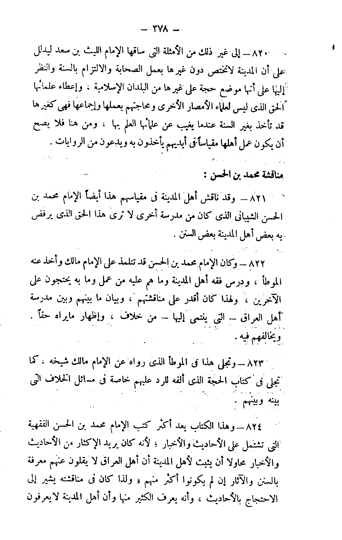 821- وقد ناقش أهل المدينة في مقياسهم هذا أيضًا الإمام محمد بن الحسن الشيباني الذي كان من مدرسة أخرى لا ترى هذا الحق الذي يرفض به بعض أهل المدينة بعض السنن.