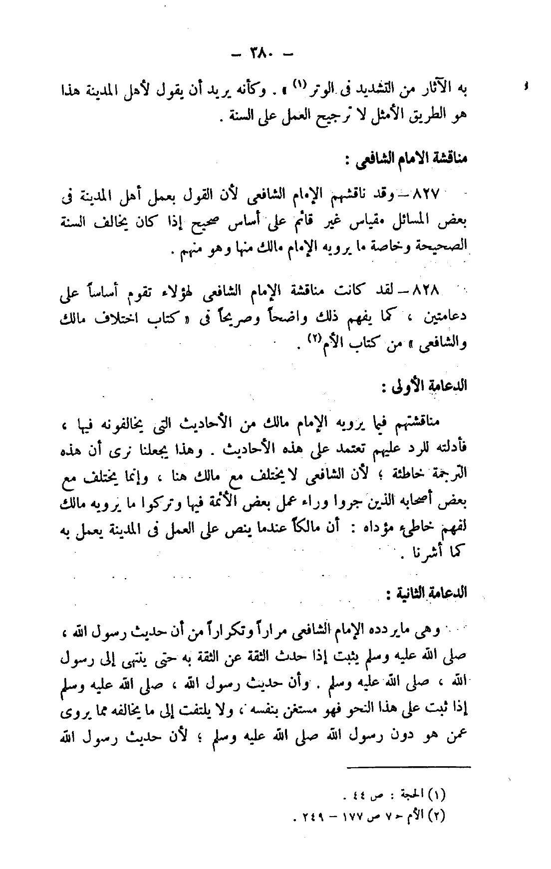 828- لقد كانت مناقشة الإمام الشافعي لهؤلاء تقوم أساسًا على دعامتين، كما يفهم ذلك واضحًا وصريحًا في "كتاب اختلاف مالك والشافعي" من كتاب الأم2.